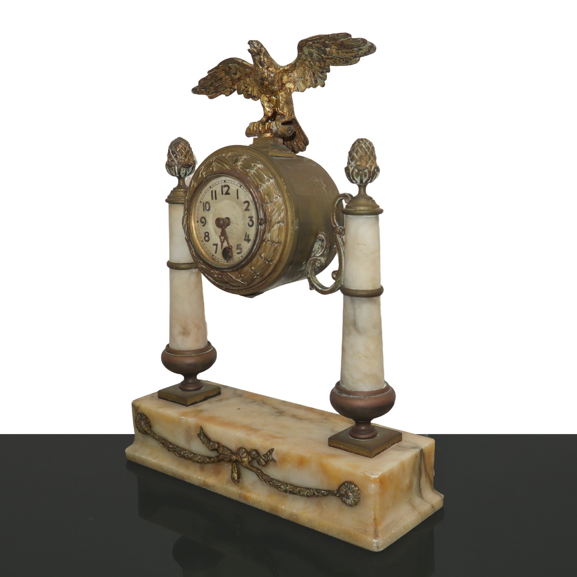 Orologio in metallo dorato sormontato da un aquila e colonne in alabastro , 19 century