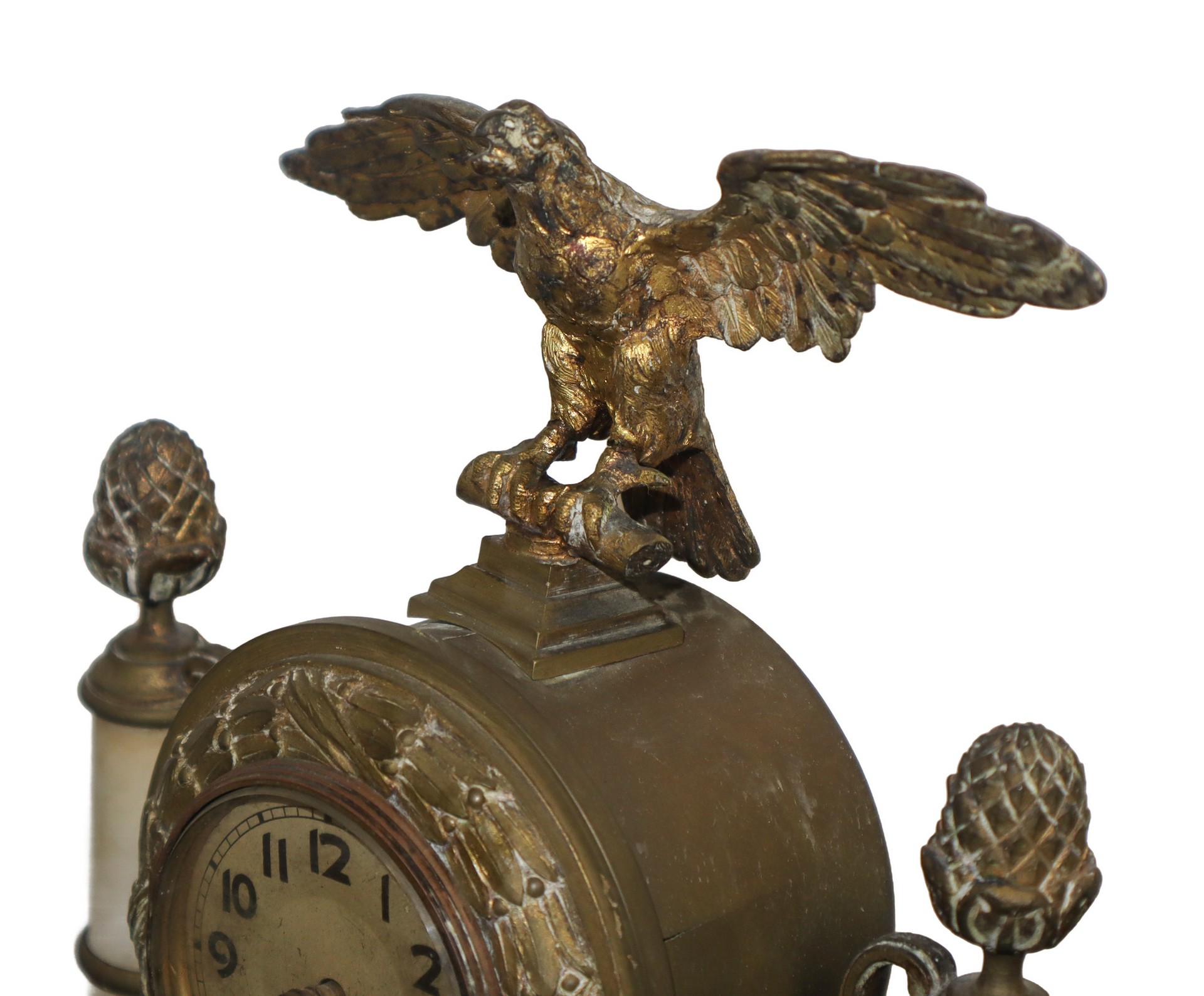 Orologio in metallo dorato sormontato da un aquila e colonne in alabastro , 19 Secolo h cm 32 x 25 x 8