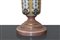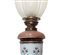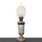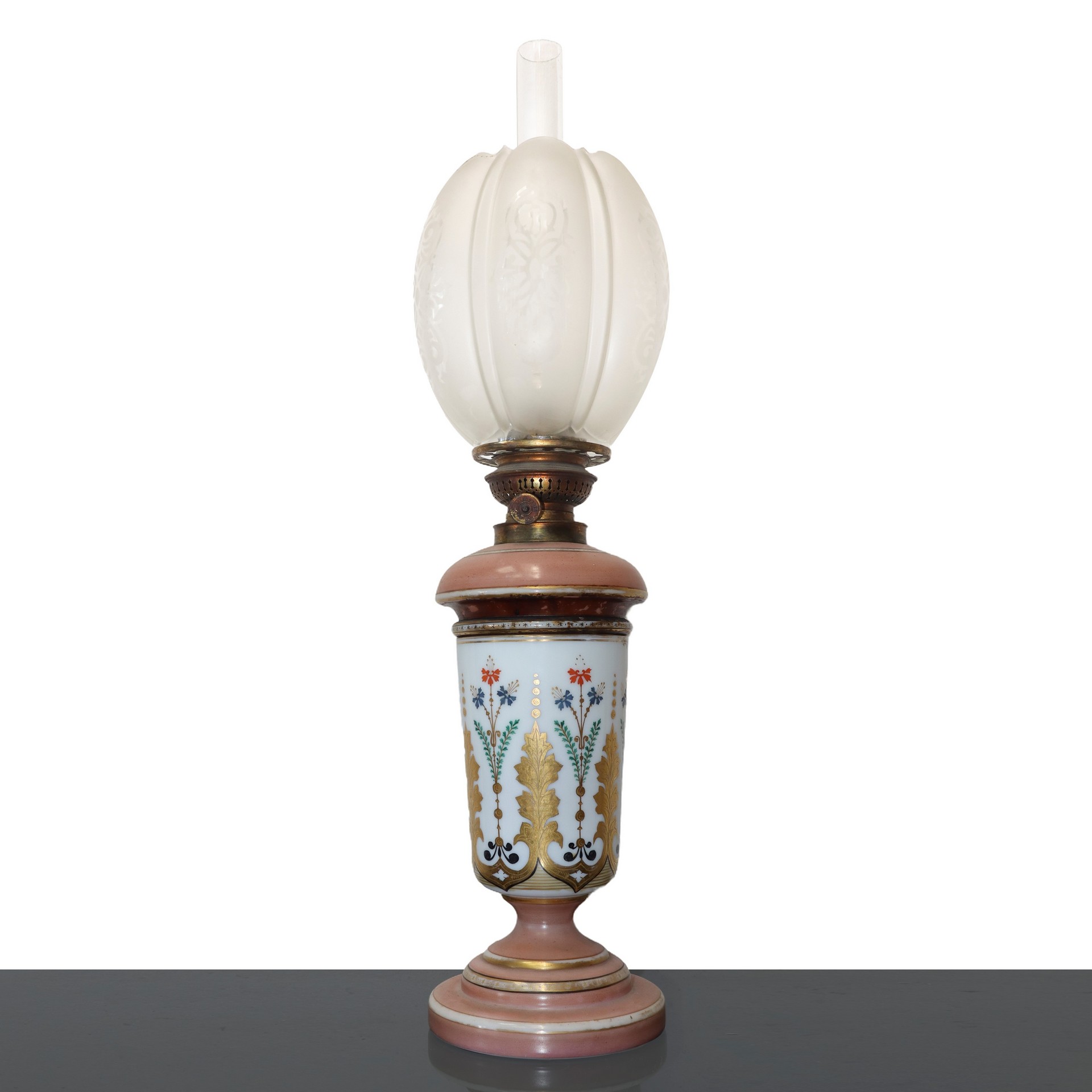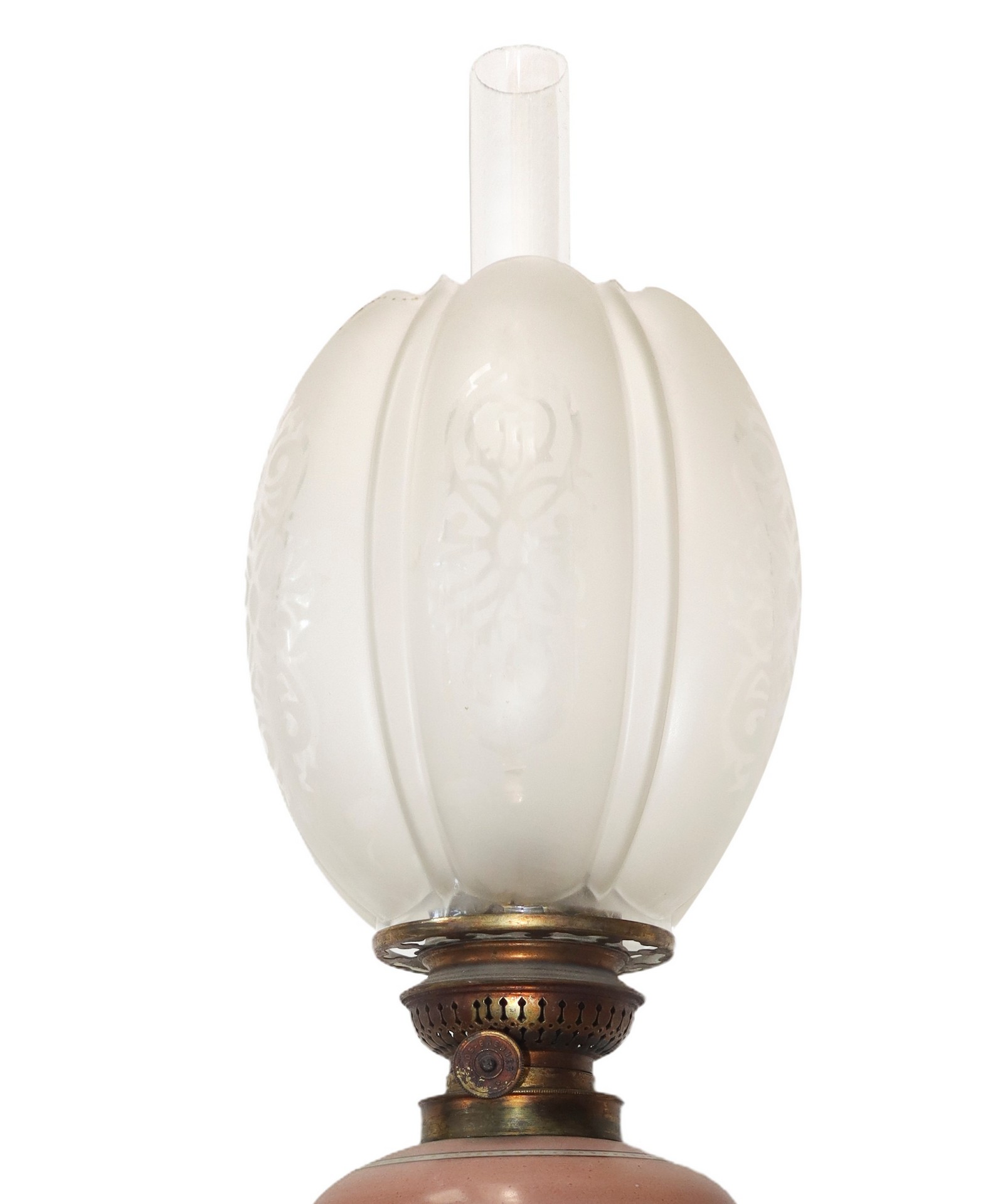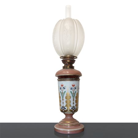 Lume a petrolio in porcellana nei toni del rosa h cm 60 Dipinto con smalti al centro policromi e dorati su base bianca. Diffusore in vetro satinatoDipinto con smalti al centro policromi e dorati su base bianca. Diffusore in vetro satinato
