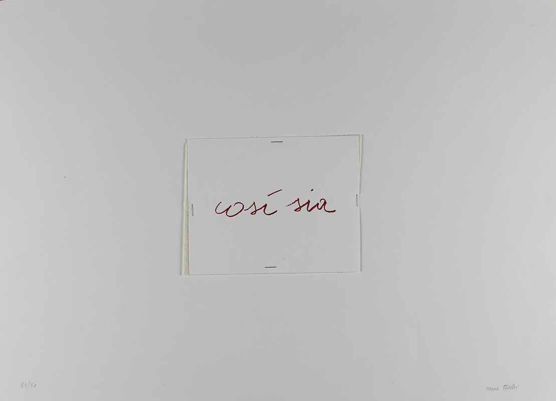 Tacchi Cesare Così sia, 1969 serigrafia e fibre sintetiche su carta, cm 50x70, es. 83/90 firmata in basso a destra, scritta serigrafata "Collocato storicamente Cesare Tacchi 12 aprile 1969 Roma" al retro