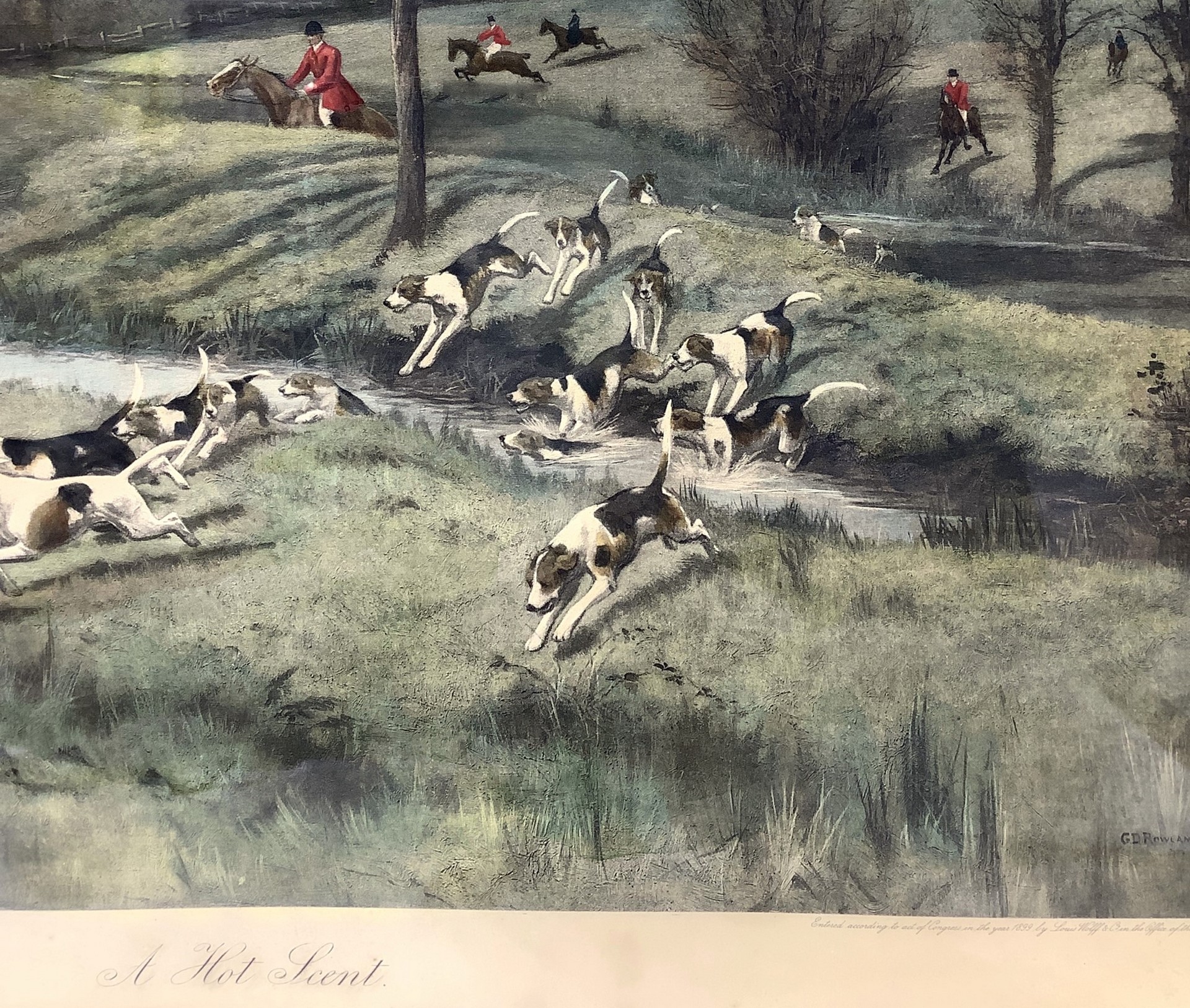 “A hot scent” scena di caccia alla volpe Mm 550x760, in cornice cm 61x81 Incisione ad acquaforte colorata a mano da George Derville Rowlandson (1861-1928), ed. Louis Wolff (1899).