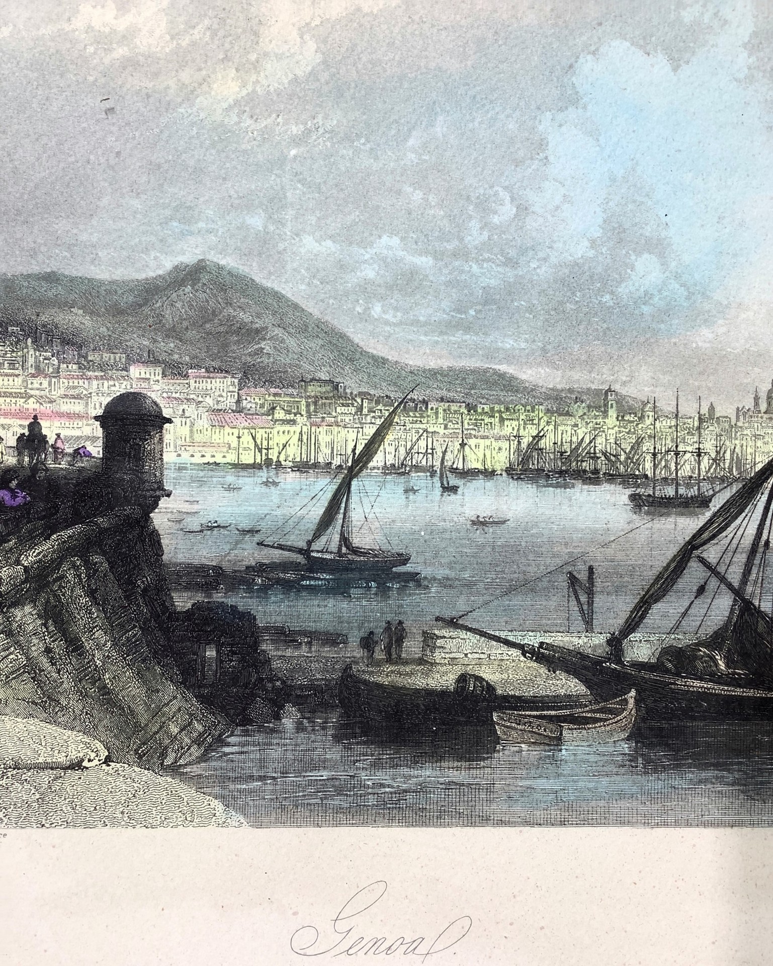 Scorcio di Genova Mm 450x580, in cornice cm 59x72 Incisione ad acquaforte colorata a mano Firmato in basso a destra R. Brandard (Inghilterra 1819-1862). Disegno di W. Brockedon tratto da W. Turton, XIX secolo. Esq.