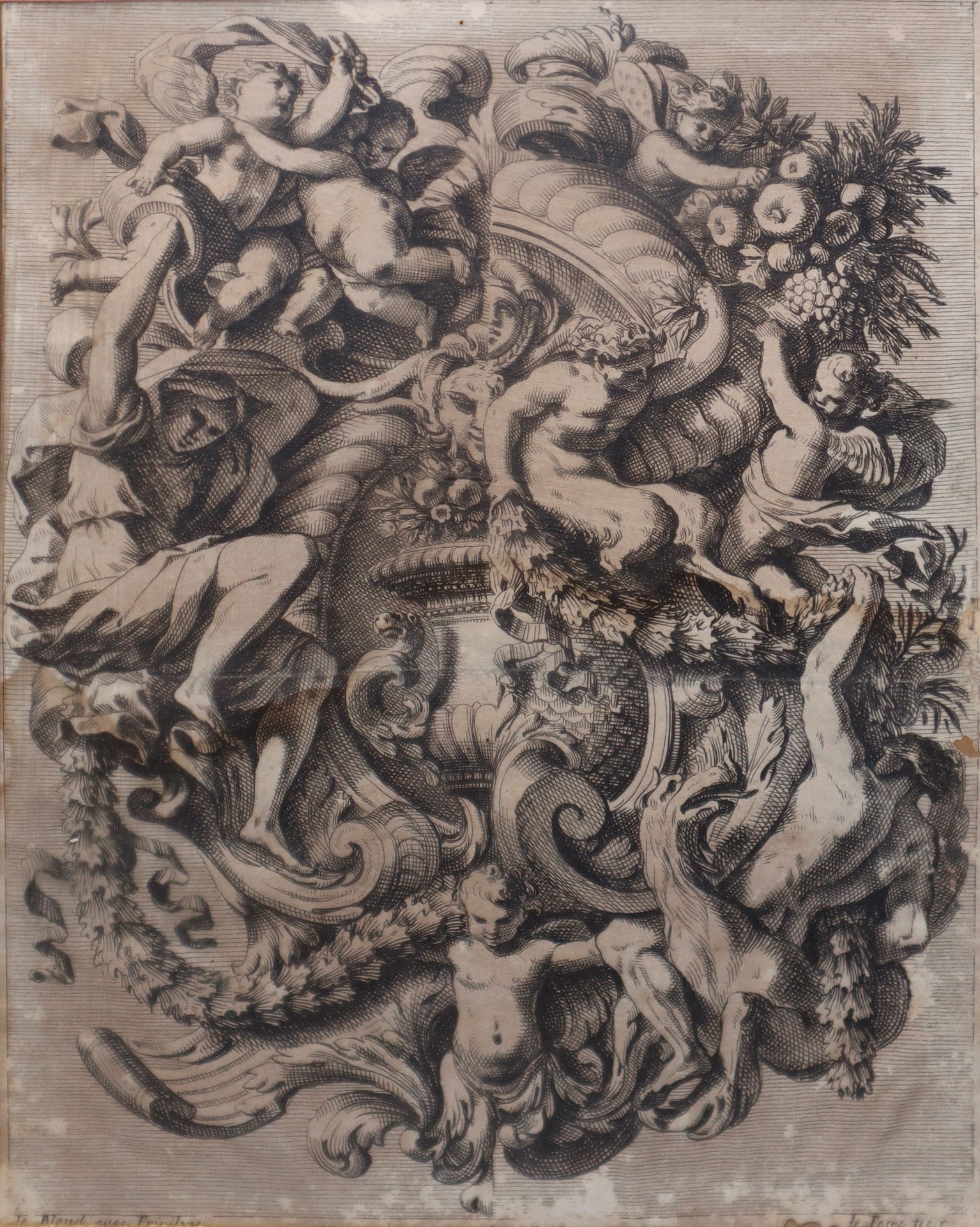 Jean Le Pautre (Parigi 1618-Parigi 1682) - Putti, fauni e ghirlande di fiori e di frutta in cornice di legno laccato H mm 47 x 60 / in cornice 67 x 80 Incisione all'acquaforte Barocca Jean Le Pautre (Architetto, disegnatore e incisore del re)
