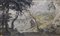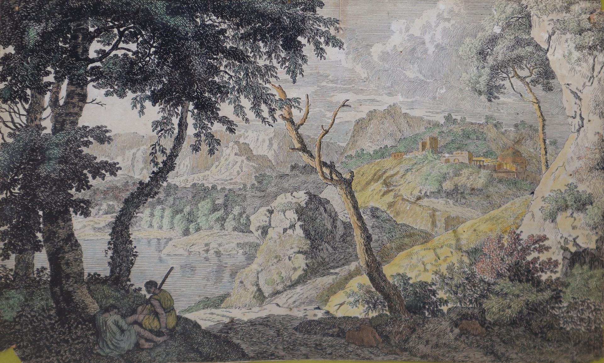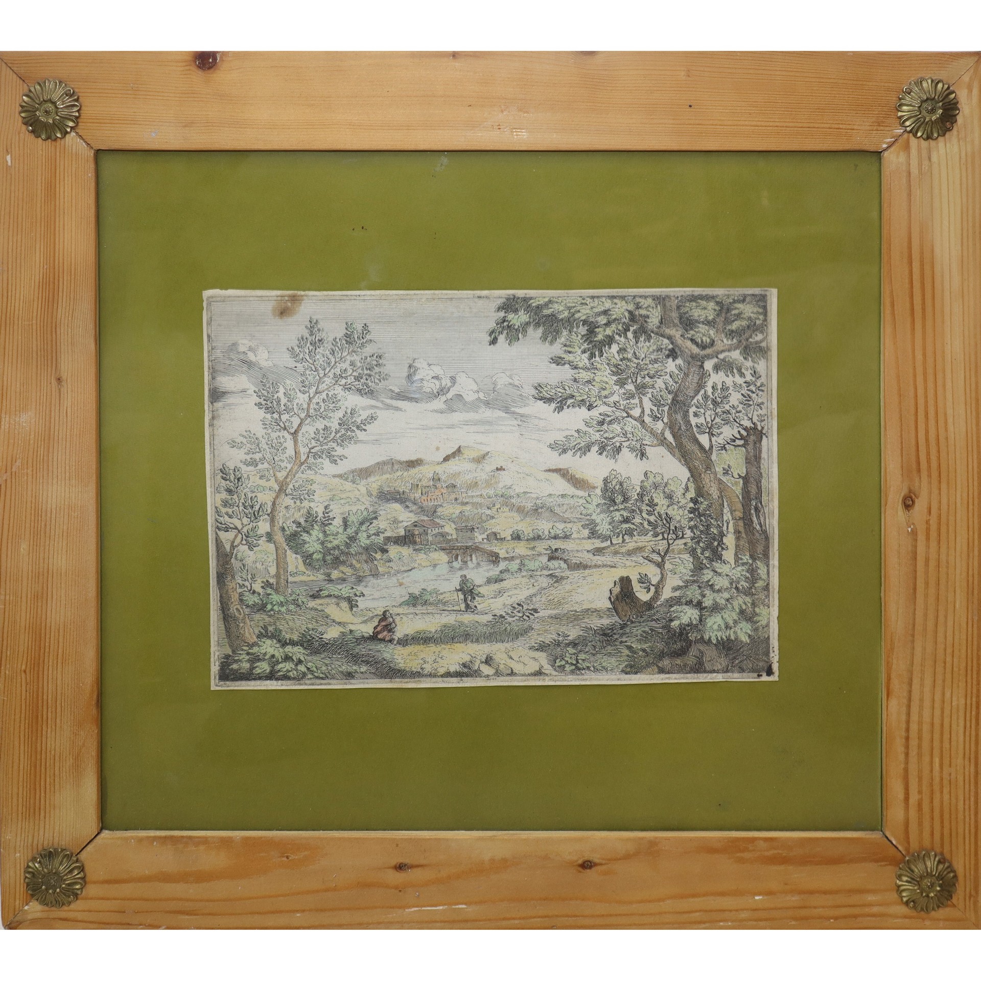 Coppia di incisioni raffiguranti paesaggio bucolico con personaggi, alberi e case H mm 228 x 357 - in cornice cm 49 x 54,5 / H mm 221 x 317 - in cornice 49 x 54,5 Incisione all'acquaforte acquerellata su carta vergata