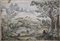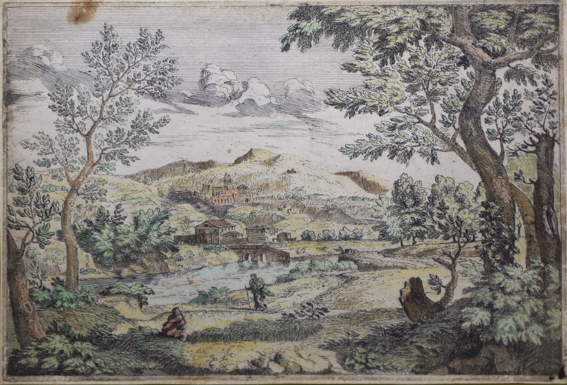 Coppia di incisioni raffiguranti paesaggio bucolico con personaggi, alberi e case