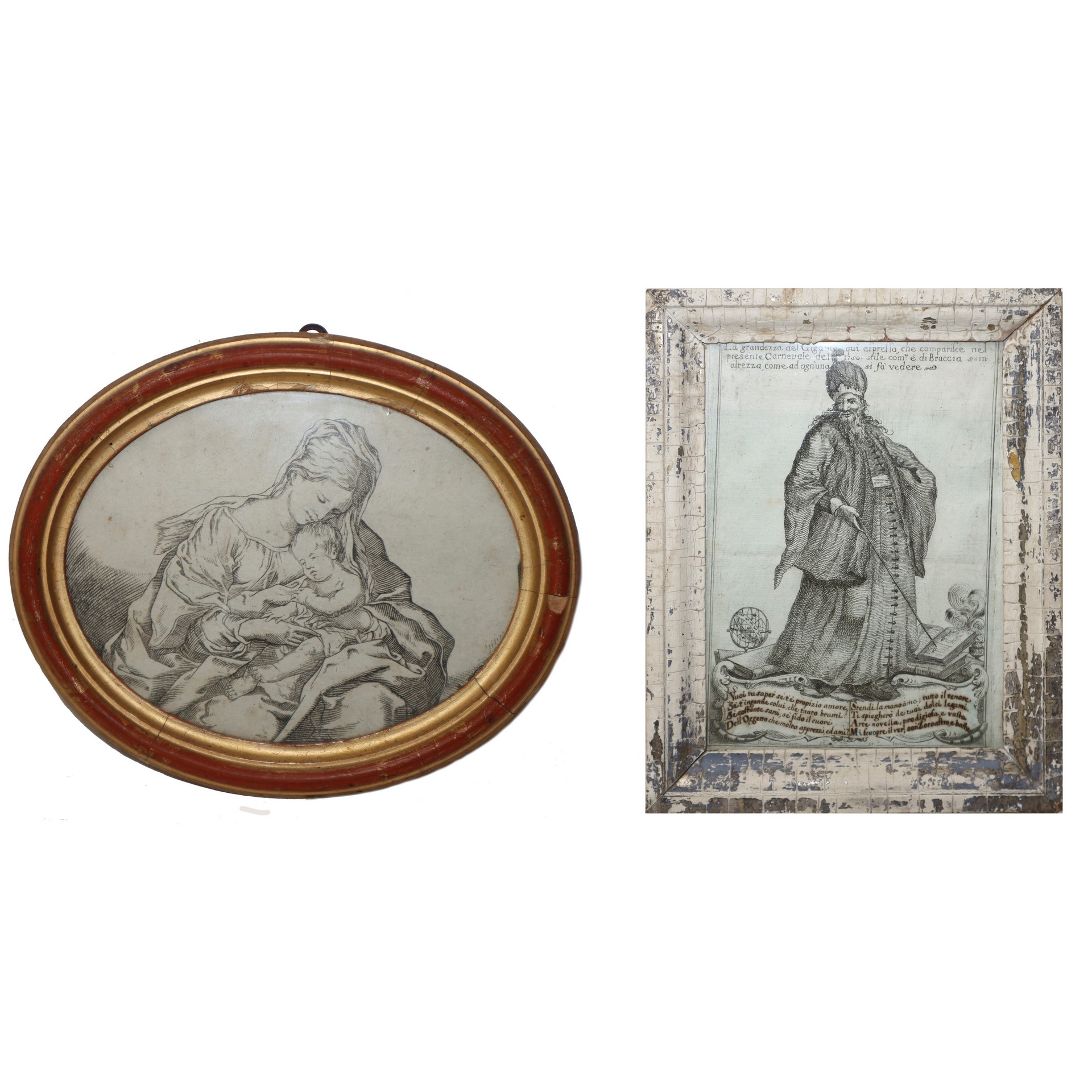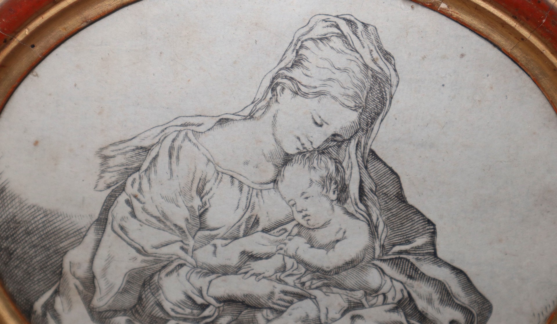 N°2 incisioni, La grandezza del gigante comparso nel carnevale del 1750 e ovale Madonna con bambino Gigante MM 220 x 157 in cornice cm 26 x 20, Madonna MM 120 x 150 in cornice dorata e laccata cm 15 x 18 Incisione all'acquaforte su carta vergata