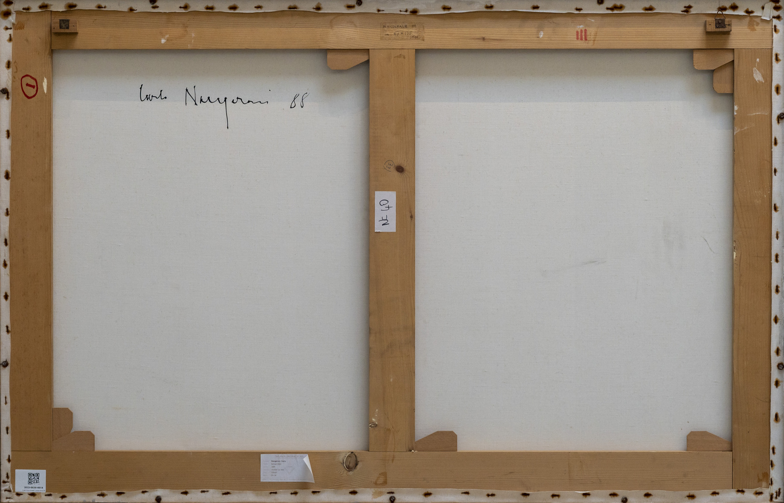 NANGERONI CARLO (n. 1922) Marginale. 1988. Acrilico su tela. Cm 135,00 x 87,00. Al retro firma, anno e cartiglio descrittivo Valente Arte Contemporanea, Finale ligure. Autentica dell'artista su fotografia. Provenienza: Valente Arte Contemporanea, Finale ligure; Collezione privata, Bergamo. Difetti.