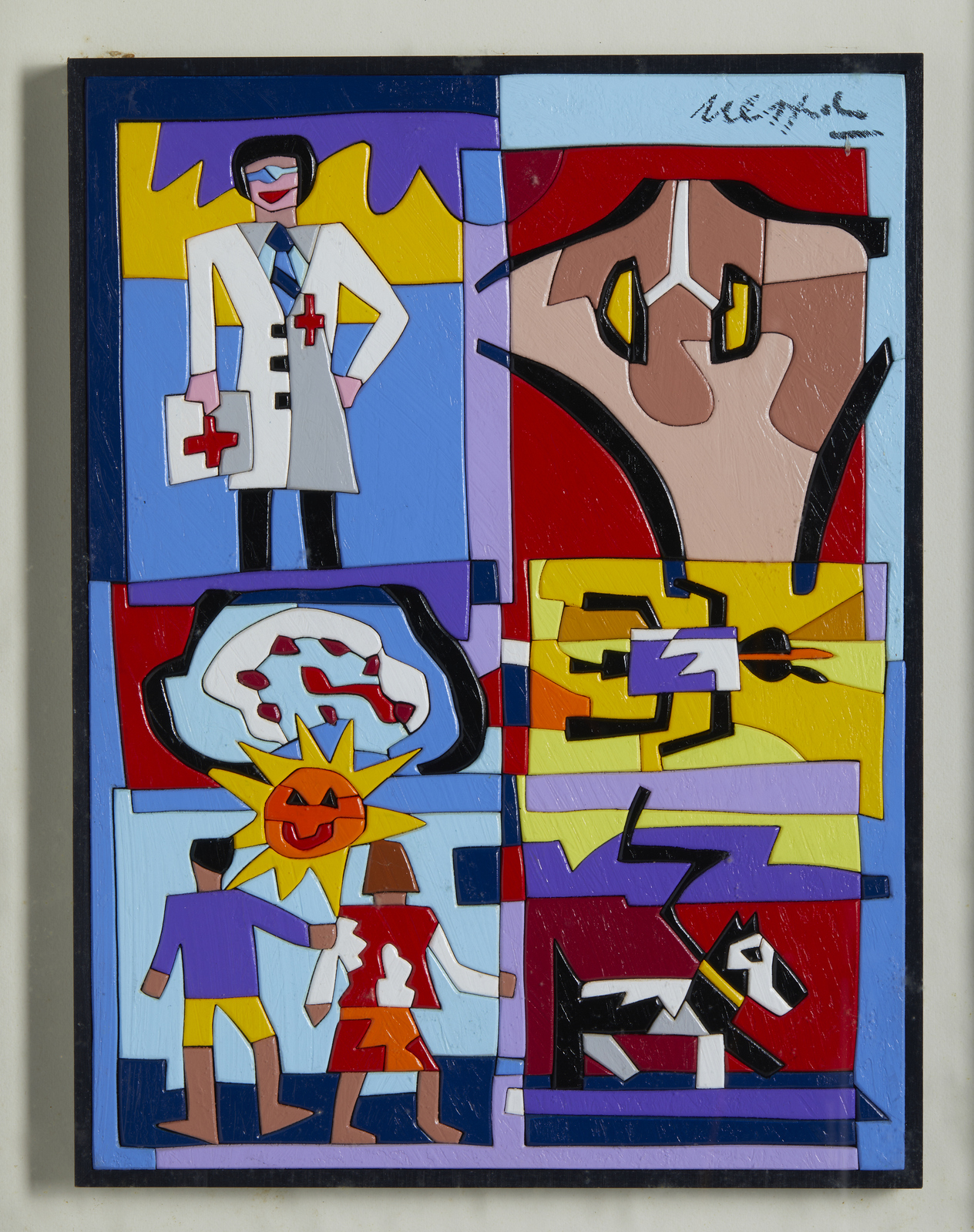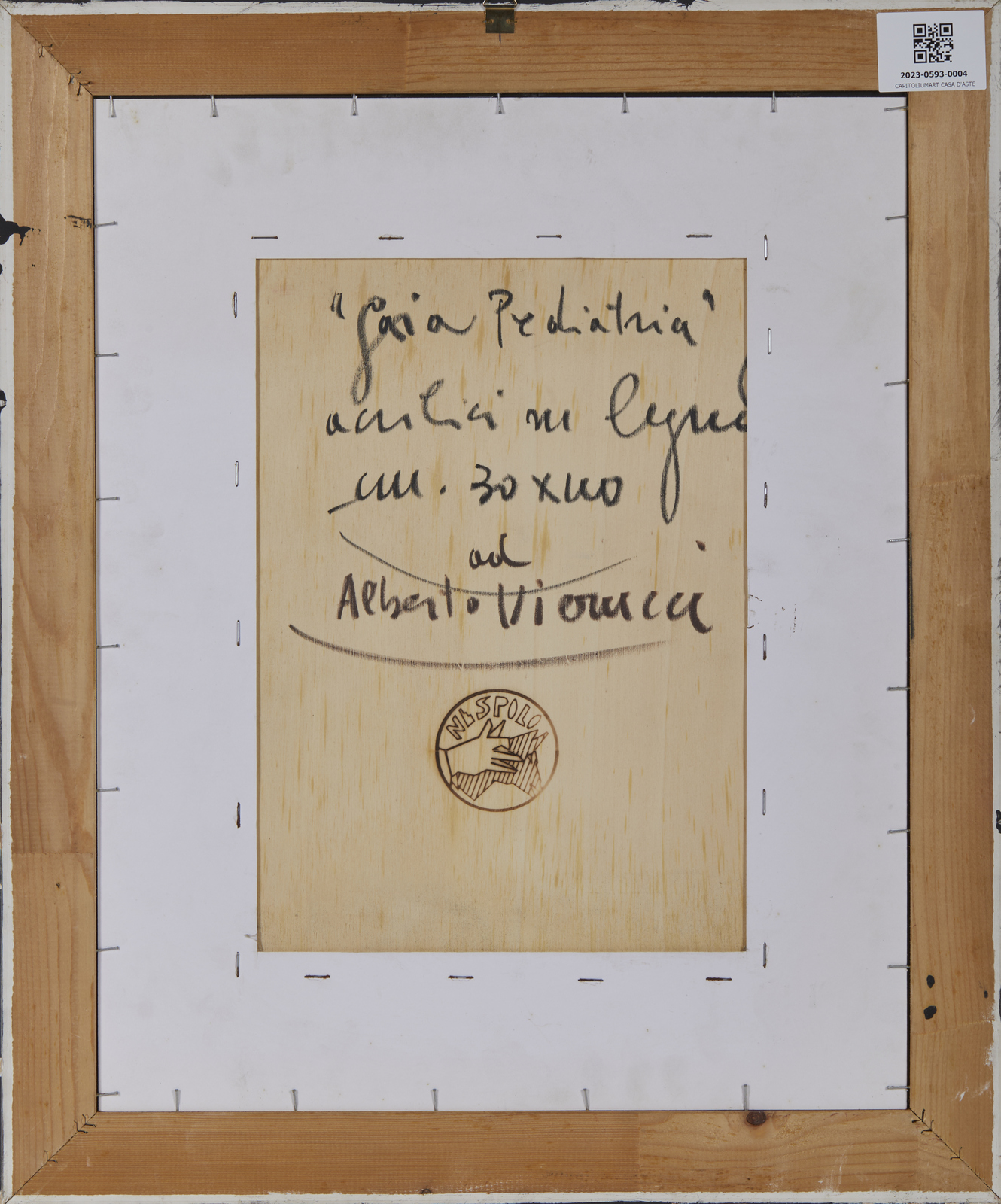NESPOLO UGO (n. 1941) Gaia pediatria. 1998. Acrilico su legno. Cm 30,00 x 40,00. Firma in alto a destra. Autentica dell'artista su fotografia. Al retro titolo, dedica e timbro dell'artista. Cornice presente