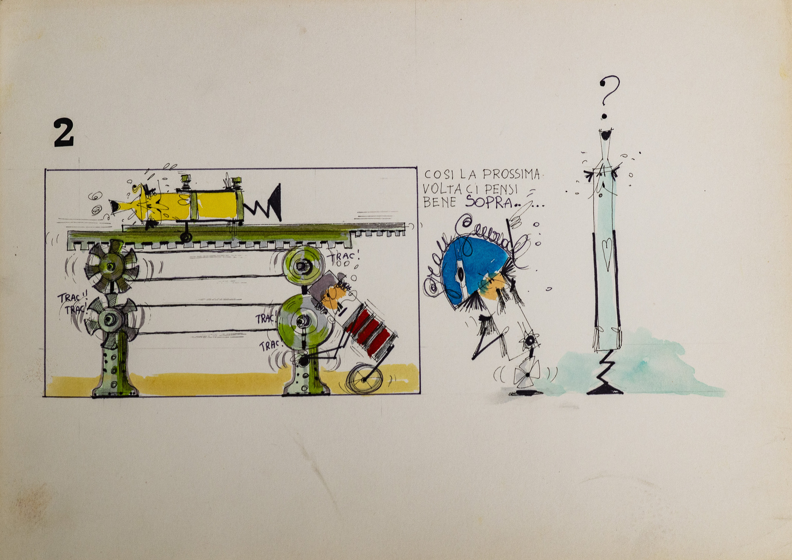 LODOLO FILM Dalla serie sketches dei Posteros. Tecnica mista su cartoncino. Cm 35,00 x 25,00. Il lotto proviene dagli archivi dei collaboratori della Lodolo Film, storica società di spot pubblicitari e di animazione italiana nata verso le fine degli anni 50. I Posteros, personaggi di fantasia, primitivi del futuro, nascono dalla collaborazione di Pino Pascali con la Lodolo film nel1958, un anno prima del suo diploma all’Accademia di Belle Arti di Roma; sodalizio che durò sino al 1967. Sandro Lodolo, titolare della casa di produzione pubblicitaria, e Pino Pascali, nel ruolo di creativo, realizzarono innumerevoli spot e cartoons pubblicitari. Gli Intermezzi che videro proprio i Posteros come protagonisti furono eseguiti , sia in bianco e nero che a colori, nel 1962 e nel 1968, anno della morte di Pascali, quando vennero ripresi da Lodolo come studio per i personaggi di un nuovo contenitore pubblicitario del secondo programma della Rai.