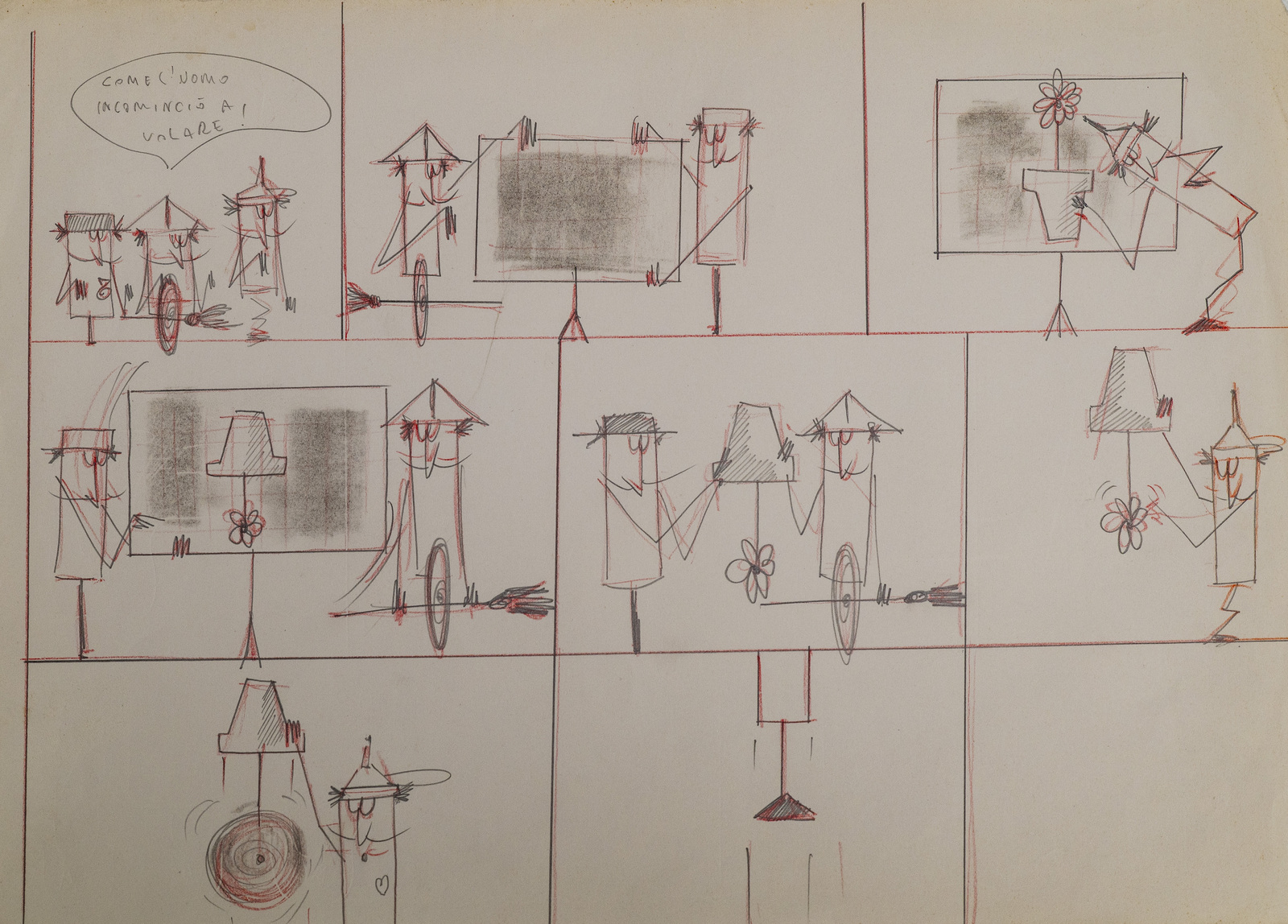 LODOLO FILM Dalla serie sketches dei Posteros. Matita e pastello su carta. Cm 35,00 x 24,00. Il lotto proviene dagli archivi dei collaboratori della Lodolo Film, storica società di spot pubblicitari e di animazione italiana nata verso le fine degli anni 50. I Posteros, personaggi di fantasia, primitivi del futuro, nascono dalla collaborazione di Pino Pascali con la Lodolo film nel1958, un anno prima del suo diploma all’Accademia di Belle Arti di Roma; sodalizio che durò sino al 1967. Sandro Lodolo, titolare della casa di produzione pubblicitaria, e Pino Pascali, nel ruolo di creativo, realizzarono innumerevoli spot e cartoons pubblicitari. Gli Intermezzi che videro proprio i Posteros come protagonisti furono eseguiti , sia in bianco e nero che a colori, nel 1962 e nel 1968, anno della morte di Pascali, quando vennero ripresi da Lodolo come studio per i personaggi di un nuovo contenitore pubblicitario del secondo programma della Rai.