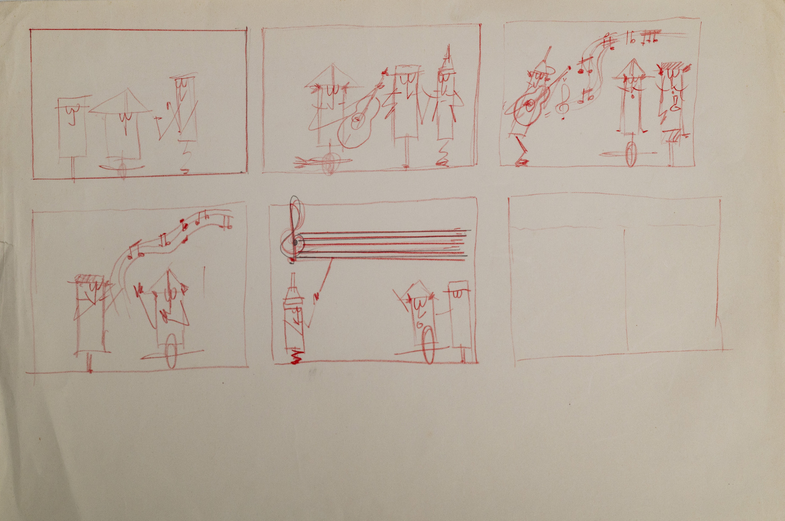 LODOLO FILM Dalla serie sketches dei Posteros. Matita e pastello su carta. Cm 35,00 x 24,00. Il lotto proviene dagli archivi dei collaboratori della Lodolo Film, storica società di spot pubblicitari e di animazione italiana nata verso le fine degli anni 50. I Posteros, personaggi di fantasia, primitivi del futuro, nascono dalla collaborazione di Pino Pascali con la Lodolo film nel1958, un anno prima del suo diploma all’Accademia di Belle Arti di Roma; sodalizio che durò sino al 1967. Sandro Lodolo, titolare della casa di produzione pubblicitaria, e Pino Pascali, nel ruolo di creativo, realizzarono innumerevoli spot e cartoons pubblicitari. Gli Intermezzi che videro proprio i Posteros come protagonisti furono eseguiti , sia in bianco e nero che a colori, nel 1962 e nel 1968, anno della morte di Pascali, quando vennero ripresi da Lodolo come studio per i personaggi di un nuovo contenitore pubblicitario del secondo programma della Rai.