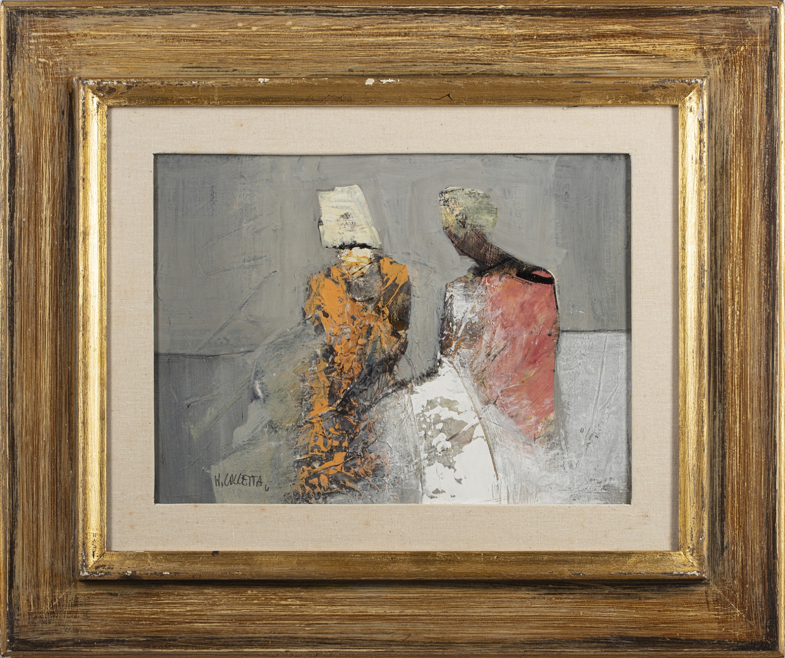 COCCETTA WALTER (n. 1951) Incontro segreto. 1993. Olio su tela . Cm 40,00 x 30,00. Firma in basso a sinistra. Al retro firma, titolo e anno. Esposizione: Museo di Pescara Gabriele D'Annunzio, 1994. Provenienza: Collezione privata, Mantova. Lievi difetti. Cornice presente