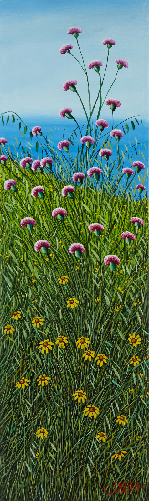 DAUREA GIOVANNI (n. 1955) Verso il mare. Olio su tela . Cm 100,00 x 30,00. Firma in basso a destra. Al retro titolo, firma e timbro dell'artista. Autentica dell'artista su fotografia. Cornice presente