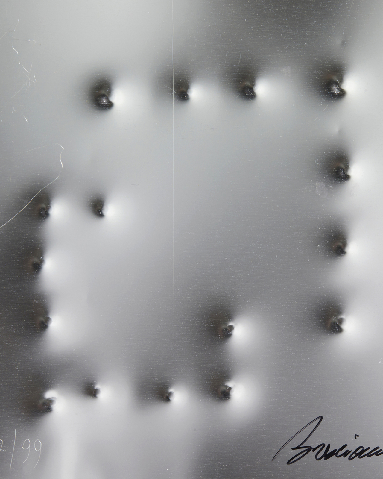 BRESCIANINI ANGELO (1948 - 2016) Senza titolo. Multiplo su lamiera. Cm 16,00 x 16,00. 57/99. Al retro tiratura a incisione e firma a pennarello. Autentica dell'artista su fotografia a cura della Galleria Minotauro Fine Art, Palazzolo sull'Oglio (Bs).