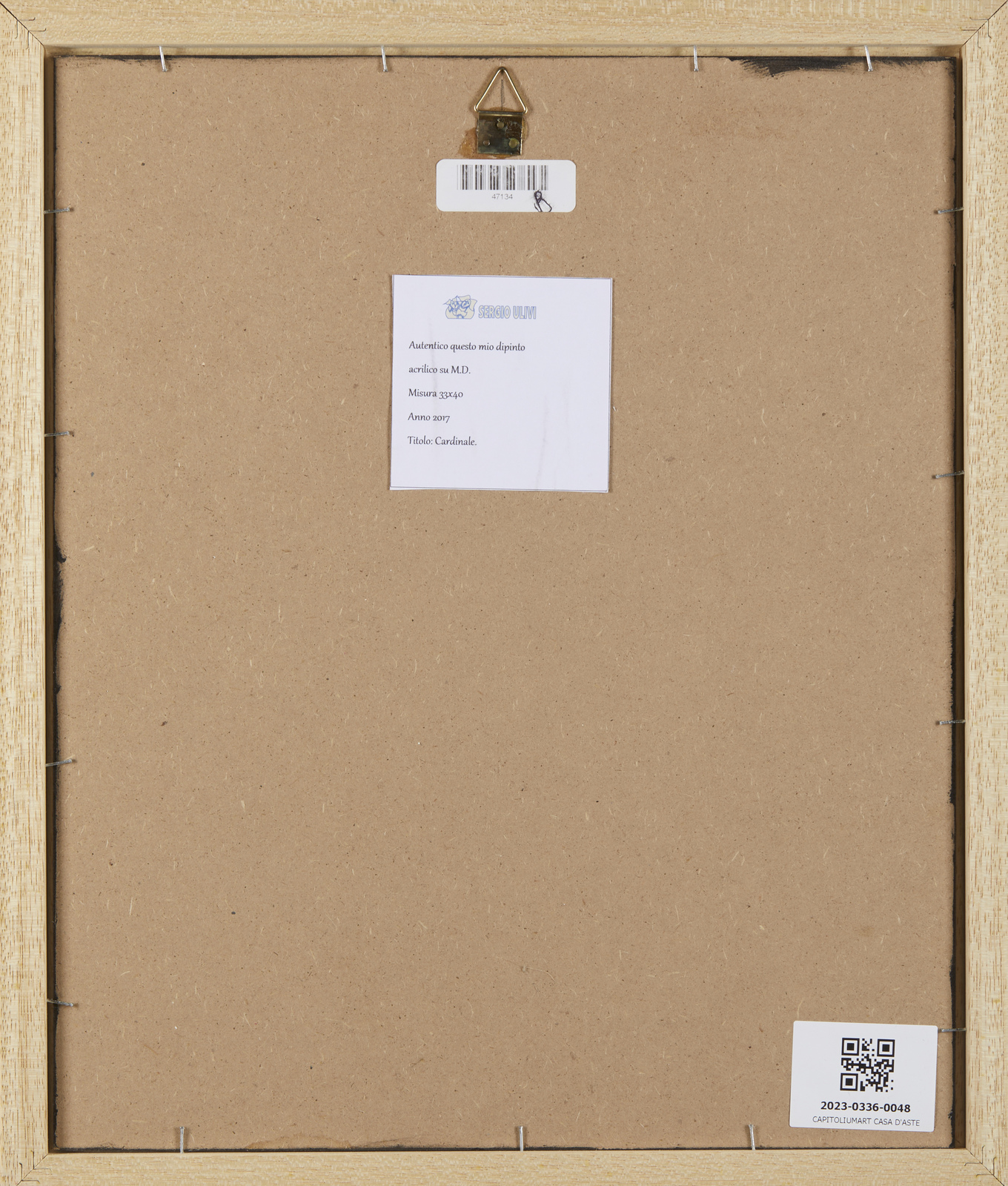 ULIVI SERGIO (n. 1955) Cardinale. 2017. Acrilico su tavola. Cm 33,00 x 40,00. Firma in basso a destra. Al retro cartiglio descrittivo.