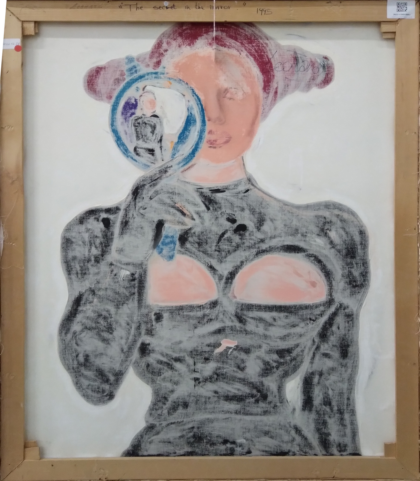 TORCHI LEONARD (n. 1973) The Secret in the mirror. 1995. Acrilico su tela. Cm 100,00 x 80,00. Al retro titolo, firma e anno. Esposizioni: Galleria d'arte Studio Cavalieri, Bologna. Pubblicazioni: Leonard, a cura di Giorgio Ruggeri, Galleria d’arte studio Cavalieri Bologna. Lievi difetti. Cornice presente