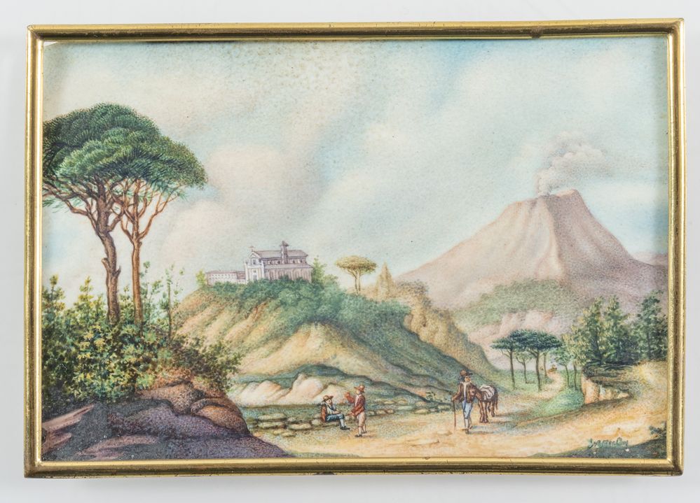 Placca in avorio, raffigurante paesaggio con vulcano e santuario. Italia, inizi del XIX secolo. Cm 7,5x11. Lotto accompagnato da certificato CITES.