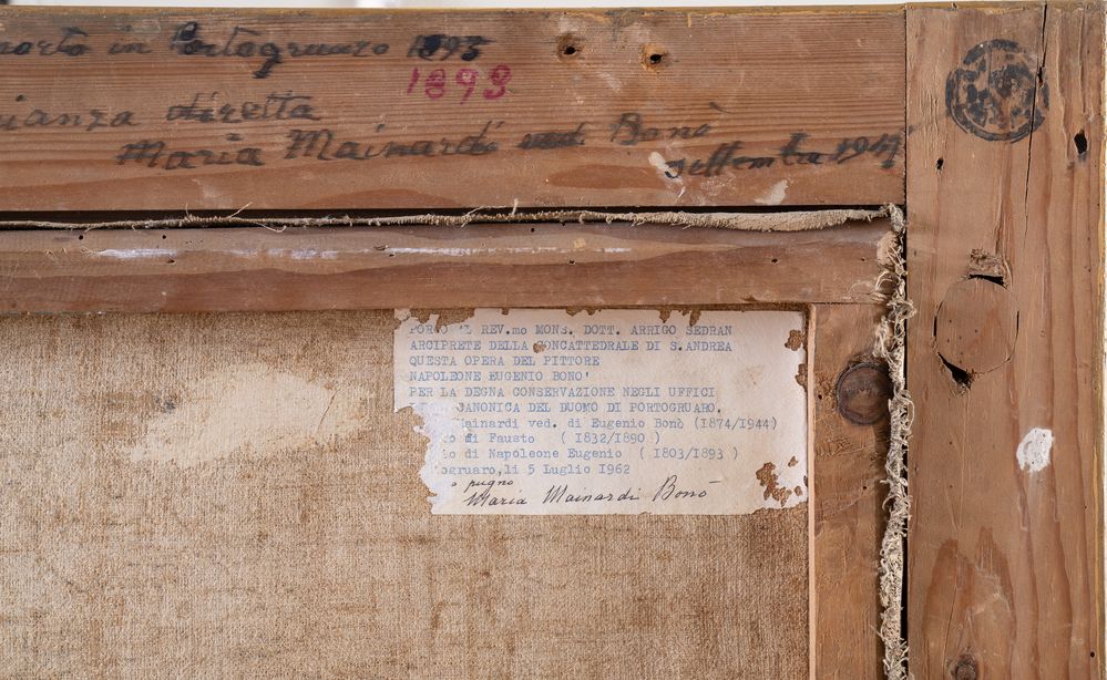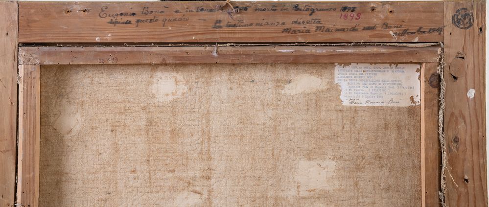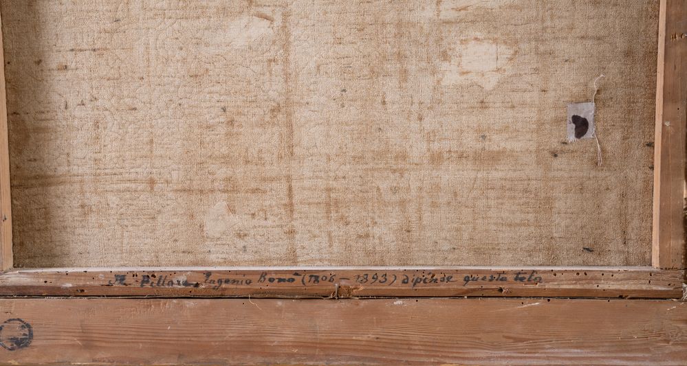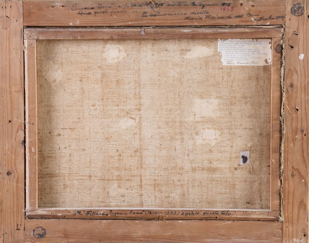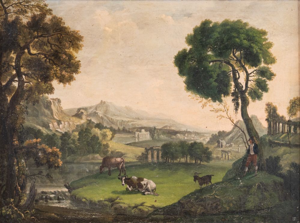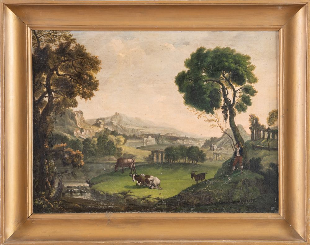 EUGENIO BONO' (Venezia 1805 -Portogruaro 1896) "Paesaggio con armenti e figure”. Olio su tela. Cm 49x66. Reca nel retro sulla cornice coeva trascrizione all’autore.