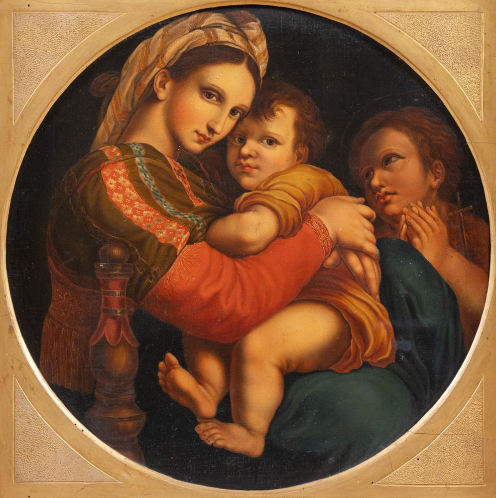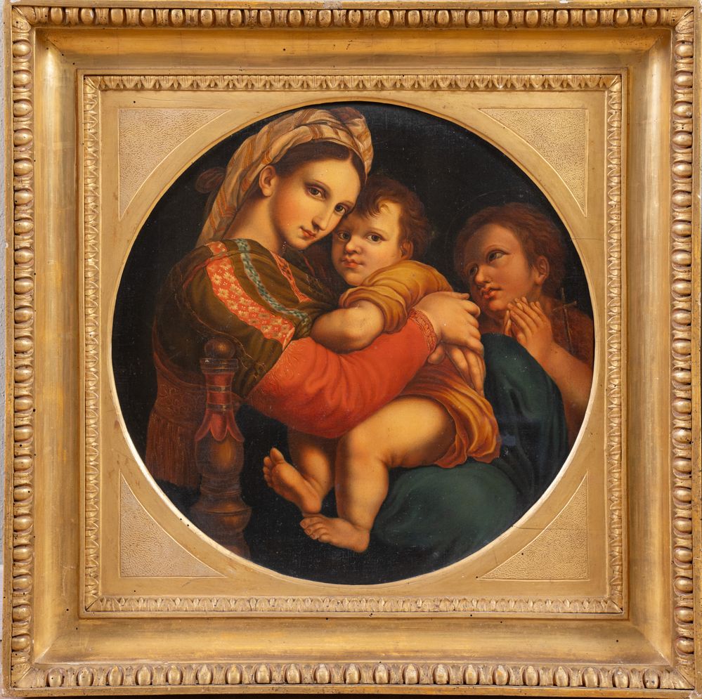Maestro del XIX secolo. "Madonna della seggiola". Olio su tela. Cm 45x45.