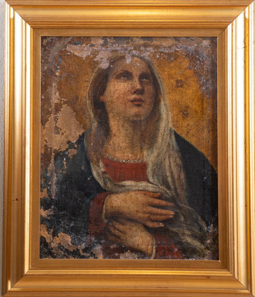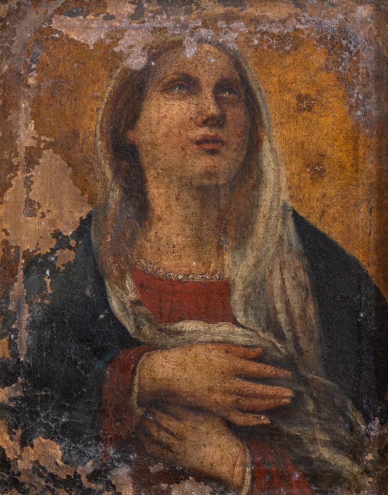 Maestro del XVIII secolo. “Madonna". Olio su tela. Cm 36,5x30,5. (restauri e...