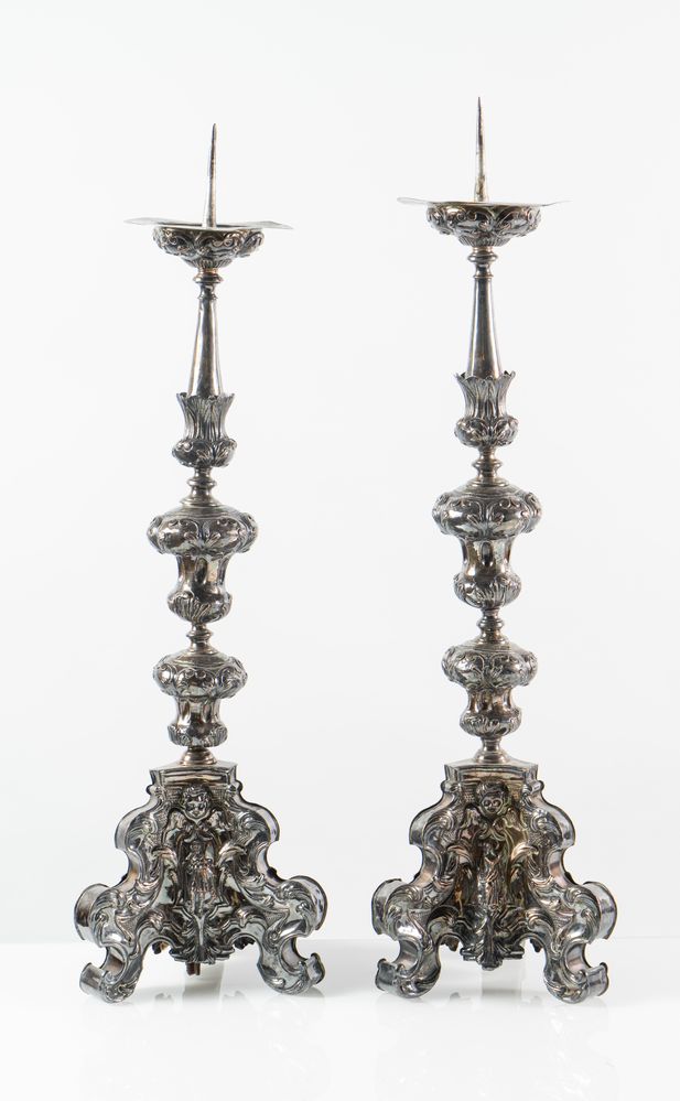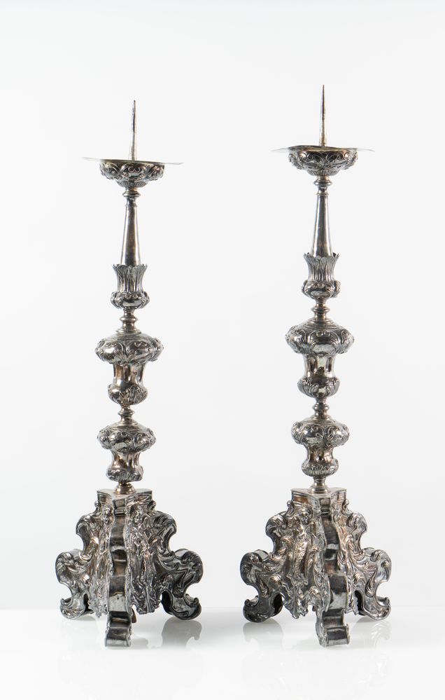 COPPIA DI CANDELABRI IN METALLO sbalzato e ARGENTATO. Italia, XVIII secolo. Cm 83,5x22,5x22,5.