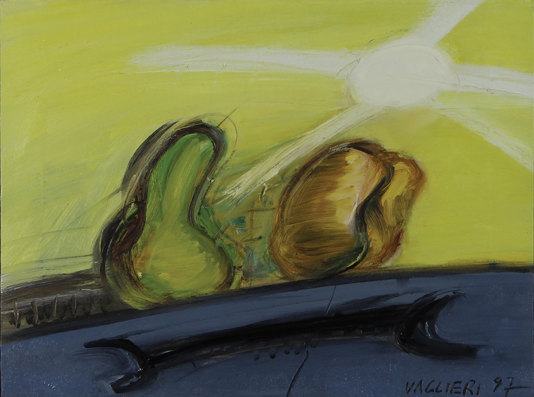 Vaglieri Tino Frutta al confine della città (con chiave meccanica), 1997 olio su tela, cm. 30x40 firmato e datato in basso a destra, firmato datato e intitolato al retro