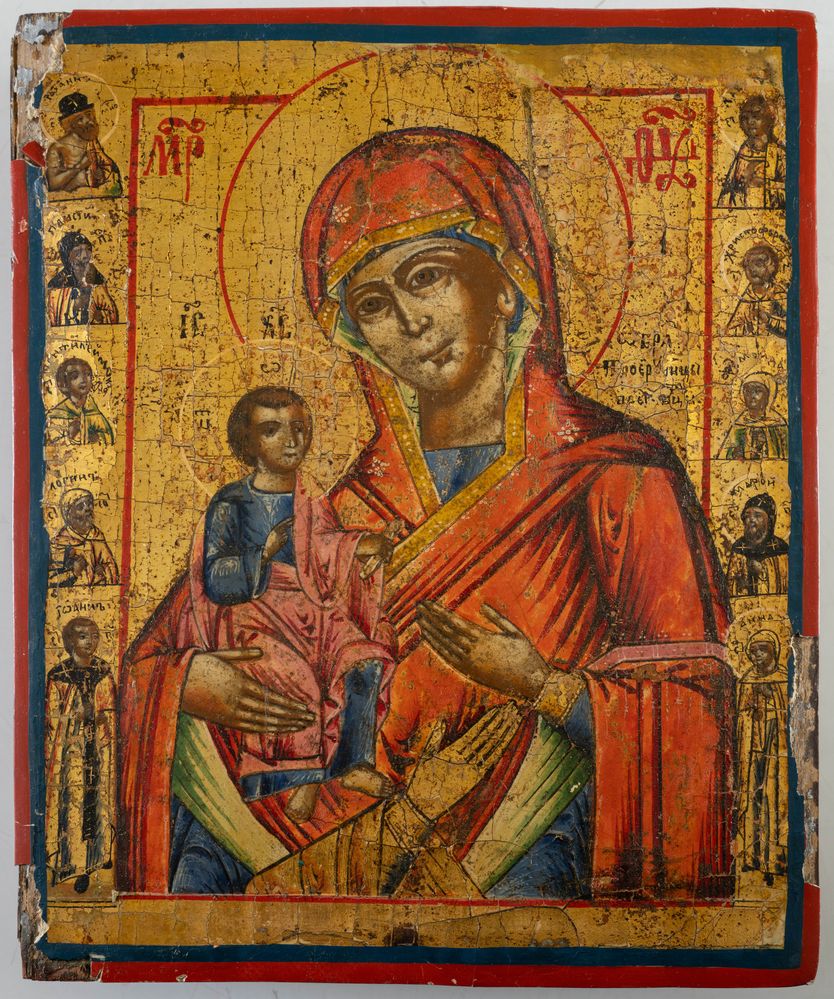 Icona, raffigurante Madonna a tre mani con Bambino, con vari santi nelle...