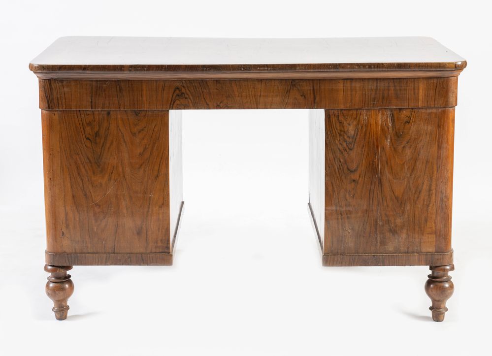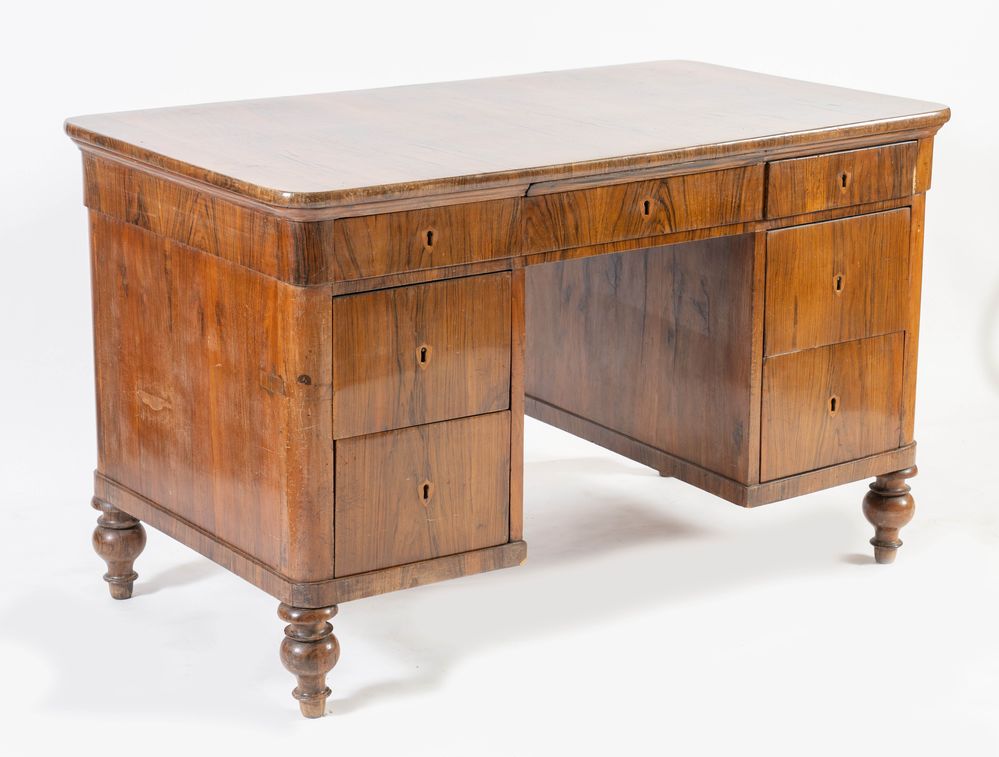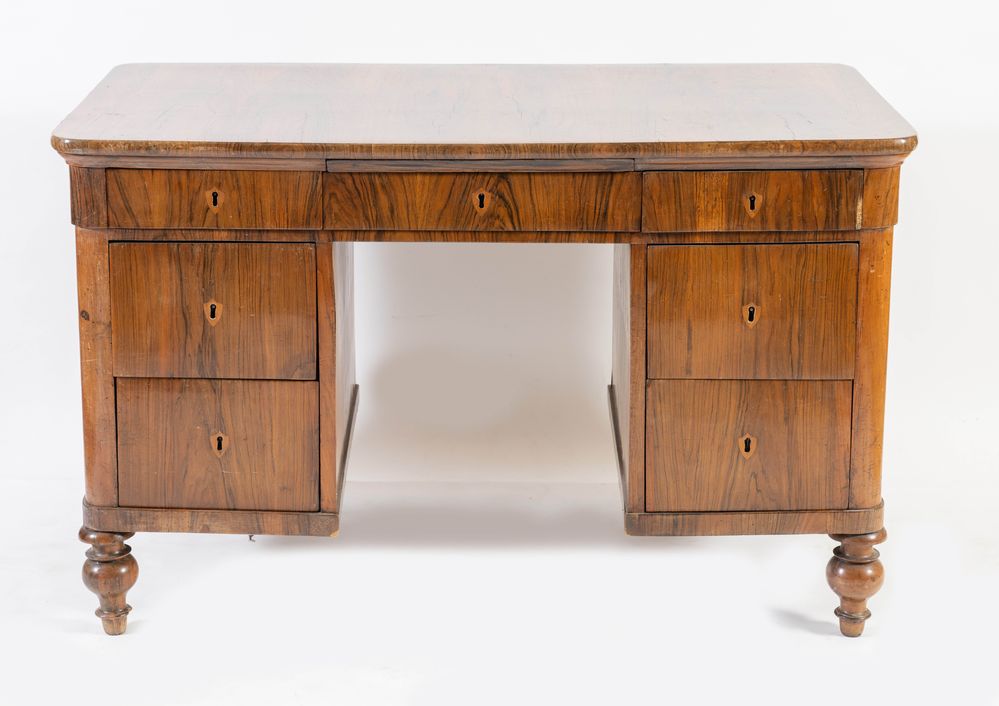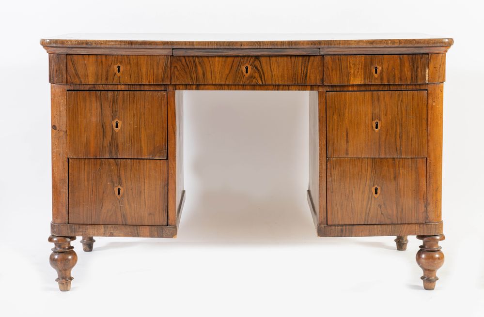 Scrivania lastronato in noce e rigatino di noce. Bologna, seconda metà del XIX secolo. Presenta tre cassetti in fascia e due per ogni corpo laterale. Piano profilato con legno di testa e sostegni in massello tornito. Cm 83,5x131,5x76.