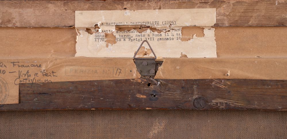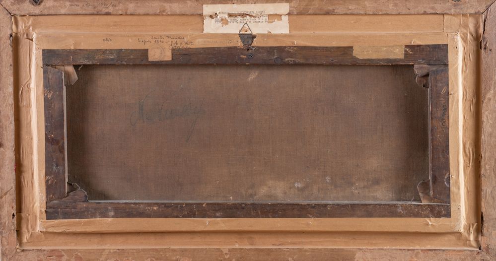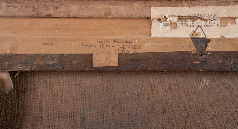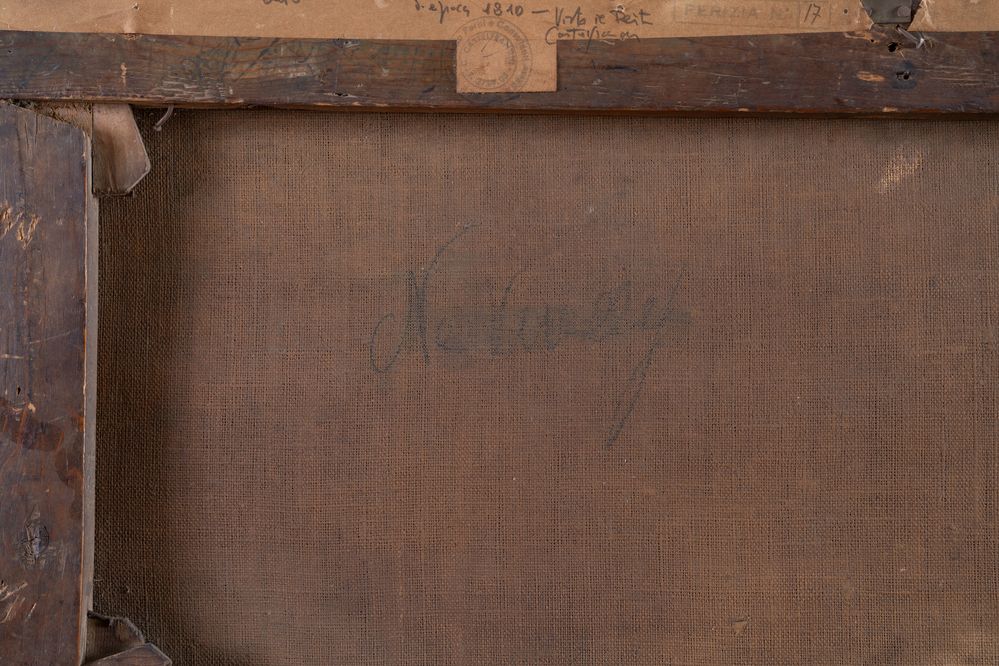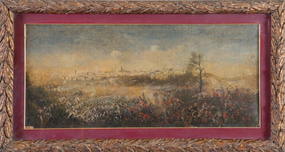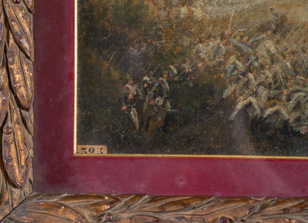 Maestro del XIX secolo. “Battaglia”. Olio su tela. Cm 34,5x72,5. Al retro reca etichetta.