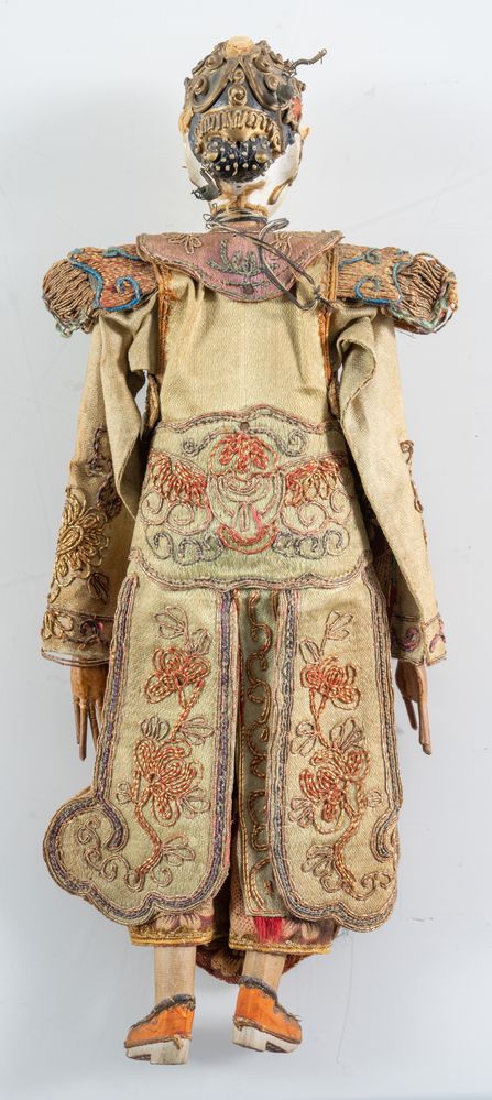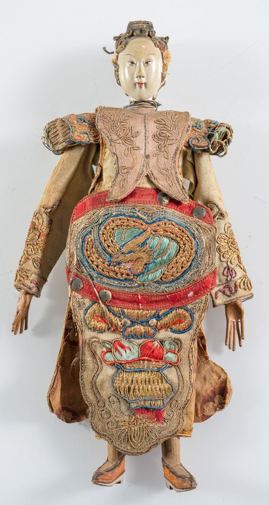 Bambola in legno e tessuto ricamato con fili argentati e dorati. Cina, inizi...