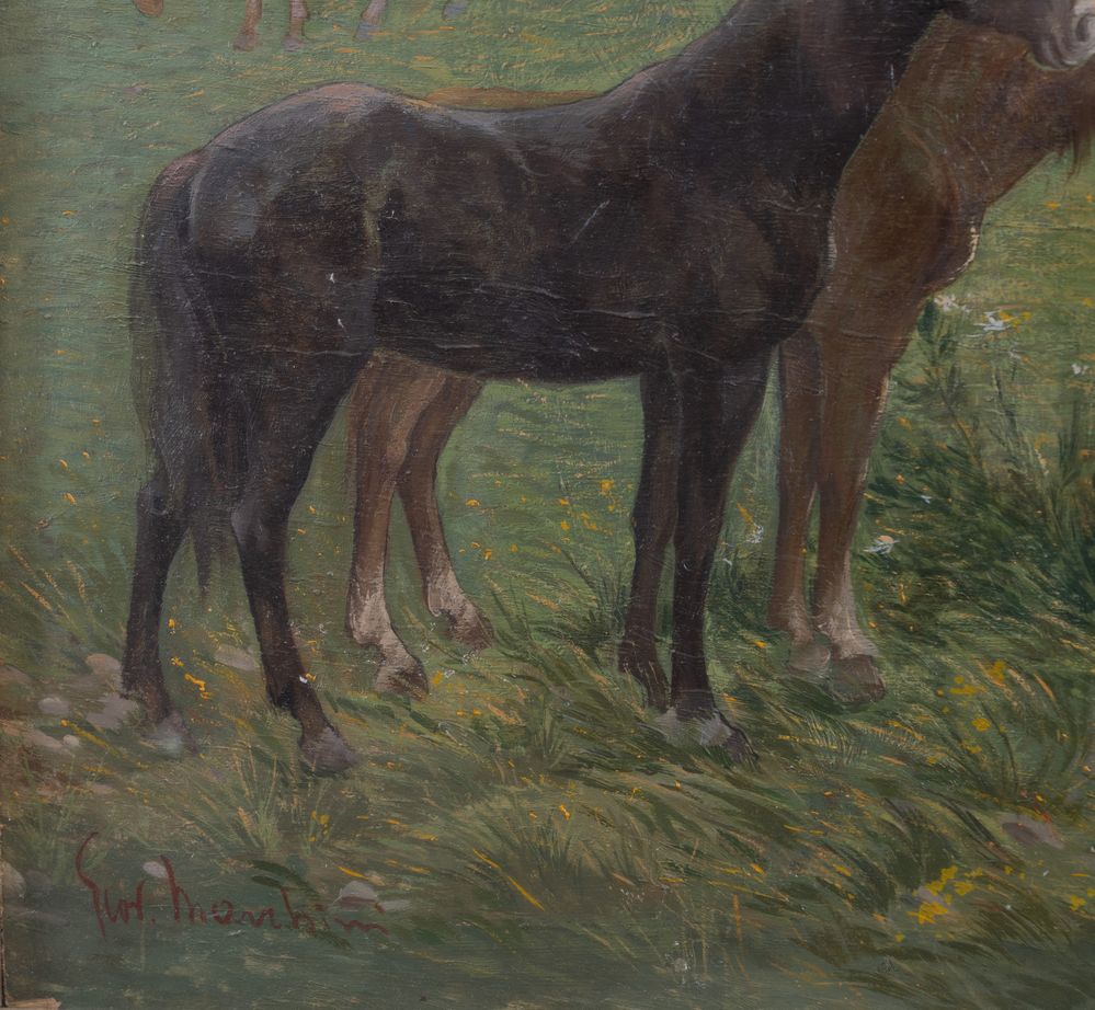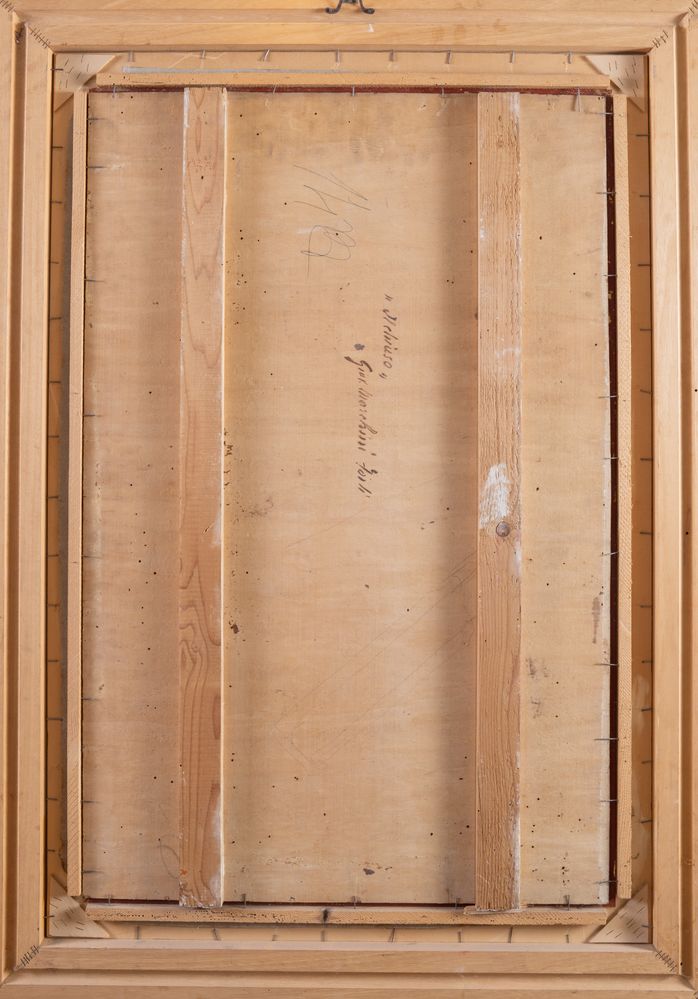 GIOVANNI MARCHINI (Forlì 1877 – 1946) "Il chiuso". Olio su tavola. Cm 98x64. Opera firmata in basso a sinistra Giov. Marchini. Al retro opera intitolata e firmata Il chiuso, Giov. Marchini.
