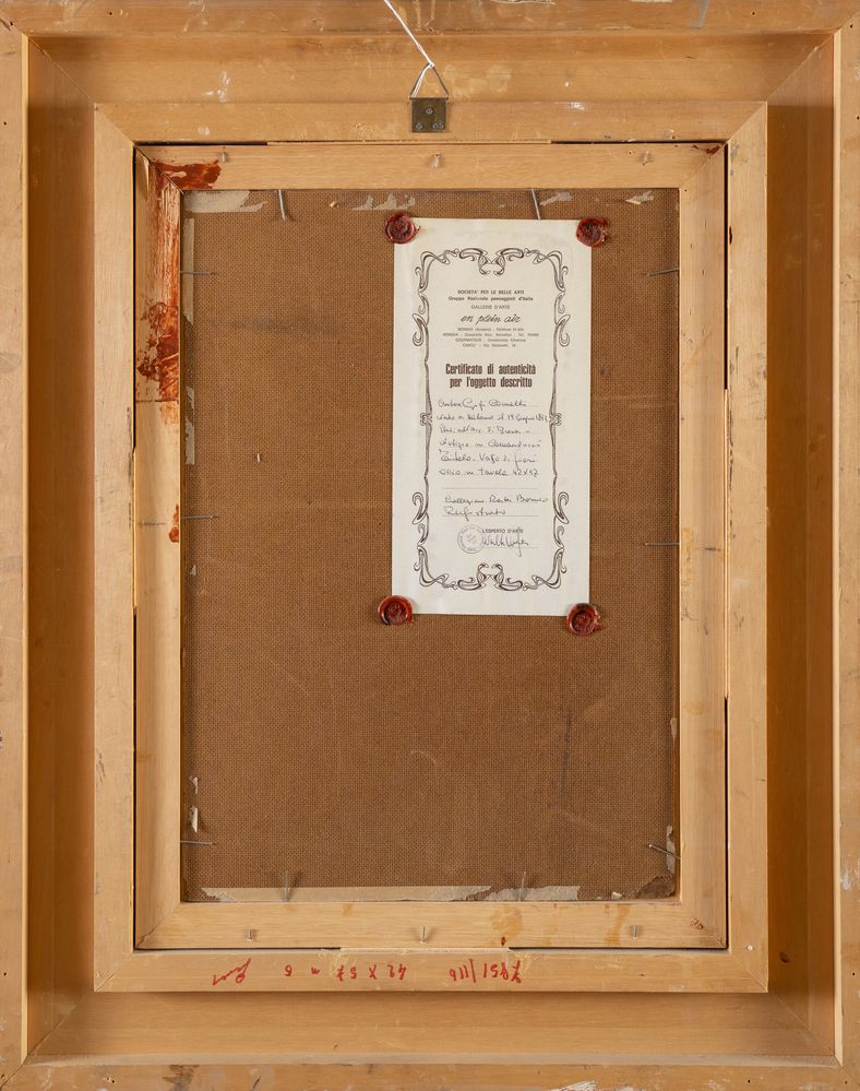 GIGI COMOLLI (Milano 1893 – 1976) "Vaso di fiori". Olio su faesite. Cm 50x34,5. Opera firmata in basso a destra GG Comolli. Al retro reca Certificato di autenticità della Società per le Belle Arti, Gruppo Nazionale Paesaggisti d'Italia.