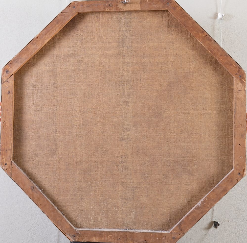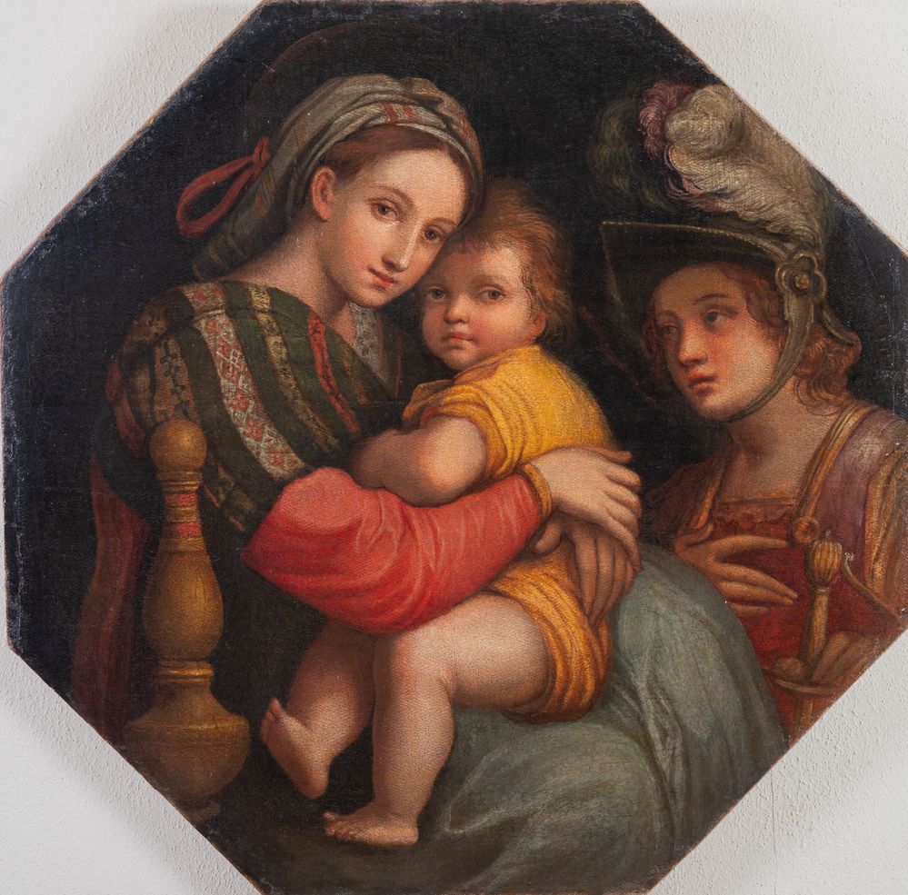 Maestro emiliano del XVII secolo. "Madonna della seggiola con San Michele". Olio su tela ottagonale. Cm 90,5x92.