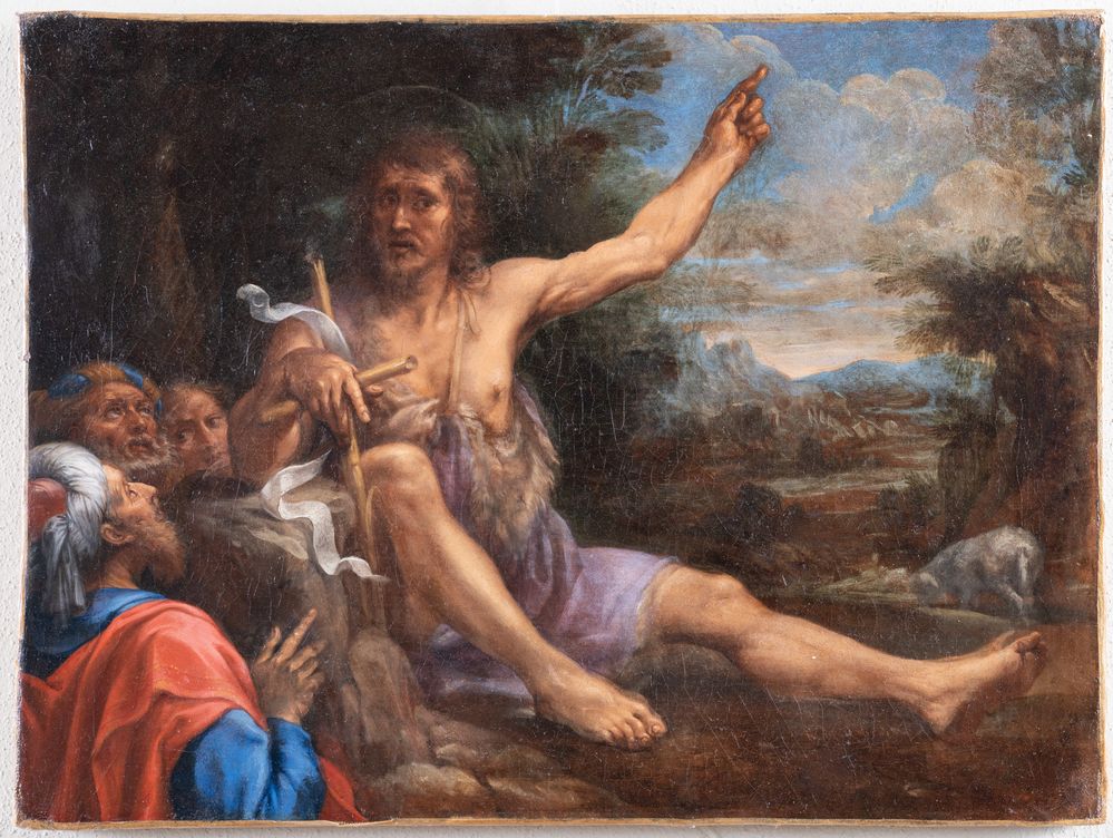 Maestro emiliano del XVII secolo. "San Giovanni Battista". Olio su tela. Cm 48x63,5.
