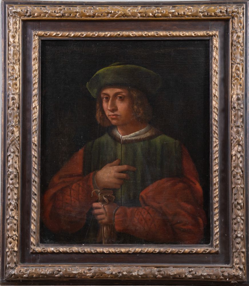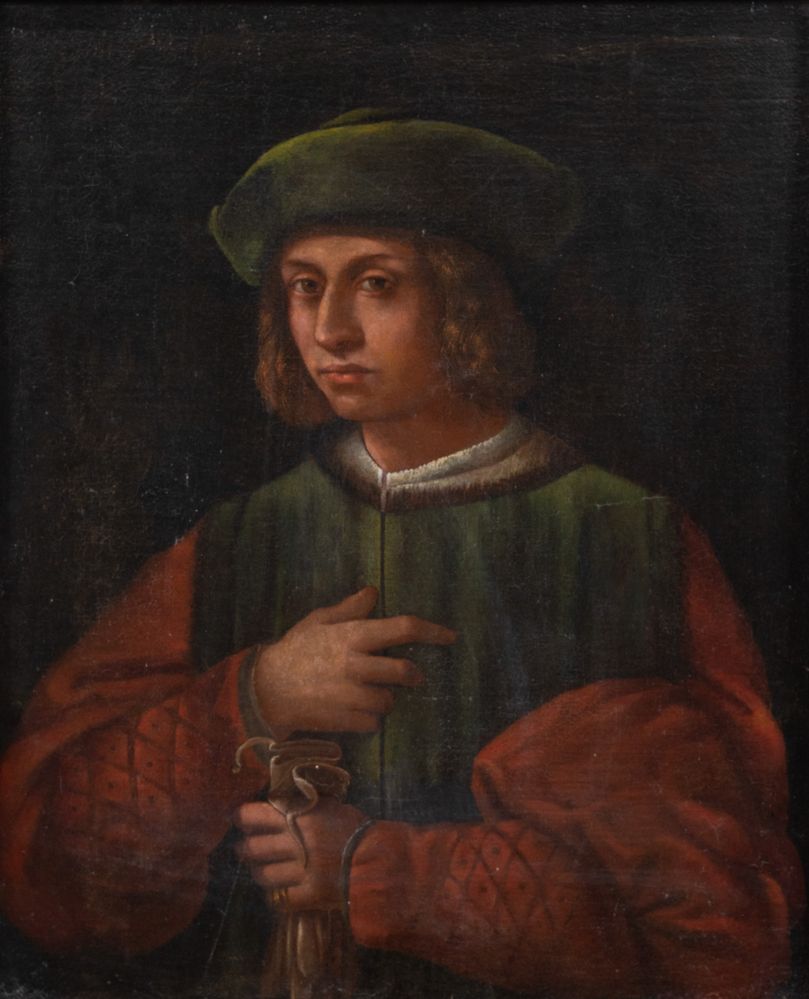 Maestro del XVII secolo. "Ritratto di giovane con guanti". Olio su tela. Cm 85x71.