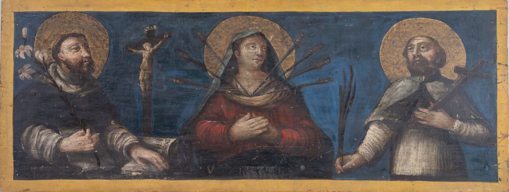 Maestro del XVII secolo. "Madonna delle Sette Spade con Santi". Olio su tavola. Cm 53,5x138,5.
