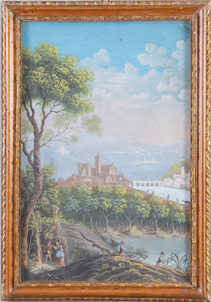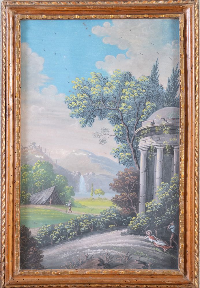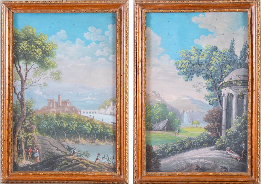Maestro della fine del XVIII secolo - inizio del XIX secolo. Coppia di paesaggi. Tempera su tavola. Cadauno di cm 58,5x37,5.