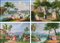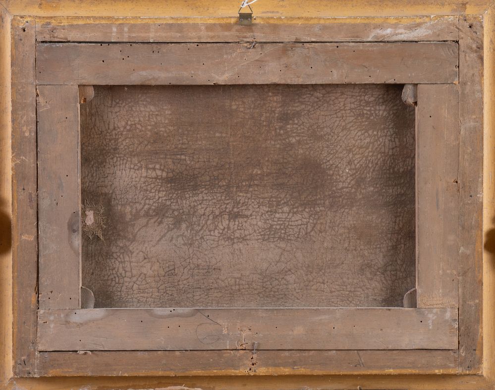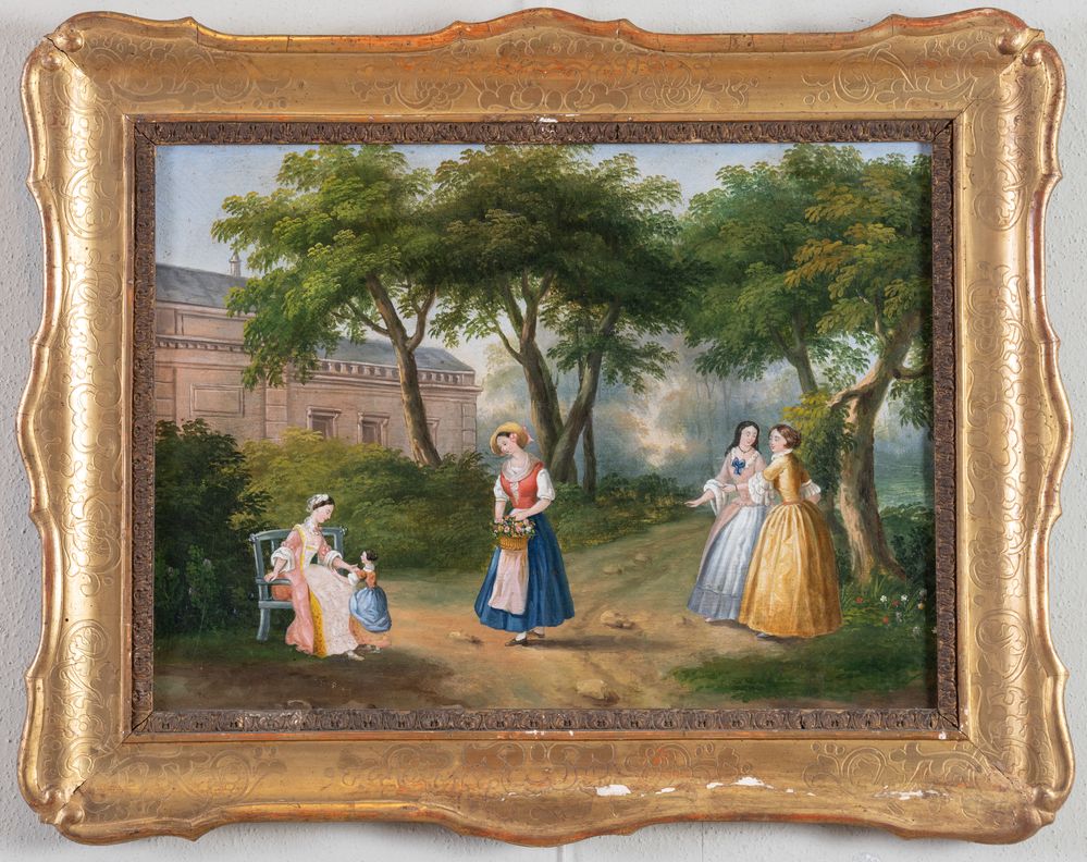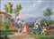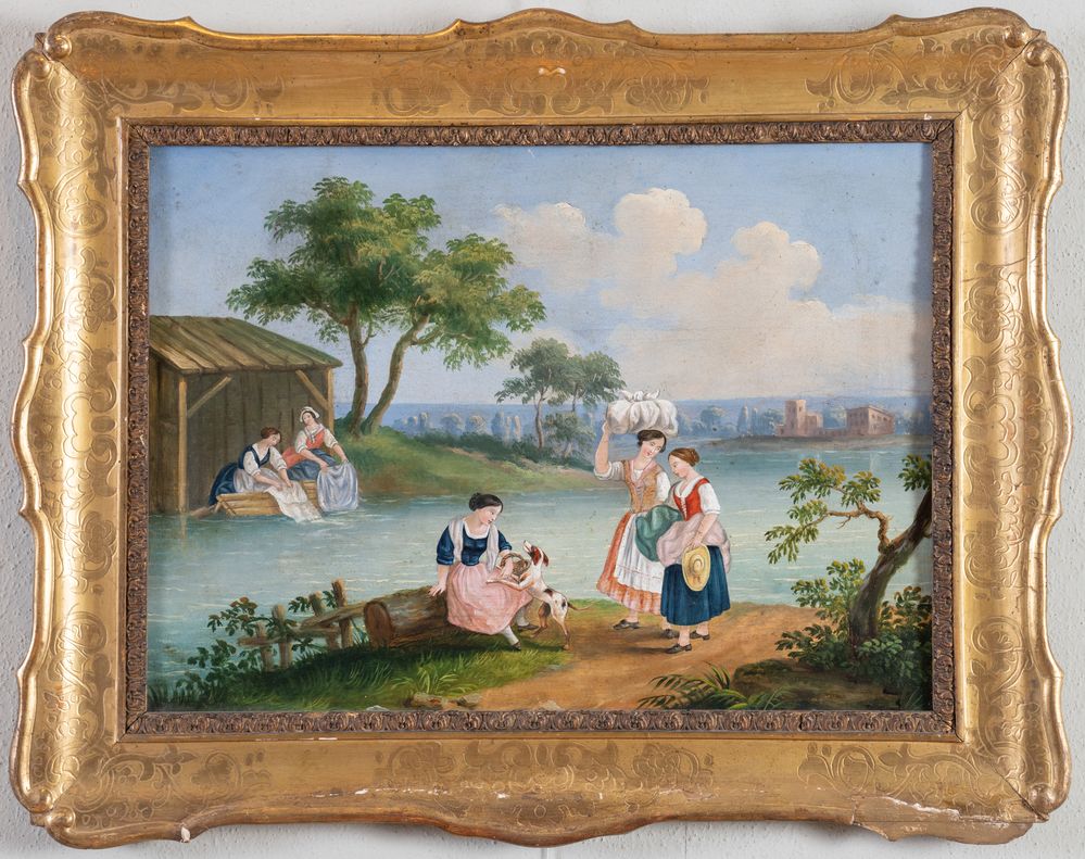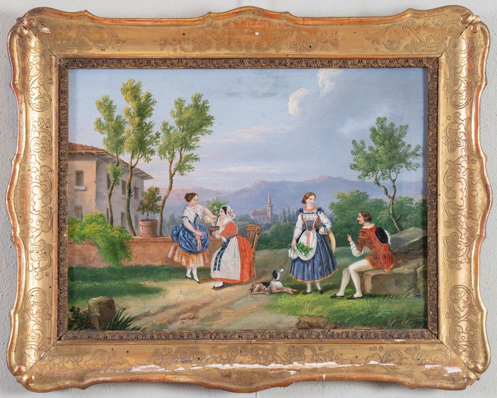 Maestro della prima metà del XIX secolo. ”Paesaggi con figure”. Lotto composto da quattro dipinti, olio su tela. Cadauna di cm 34,5x47. Cornici coeve.