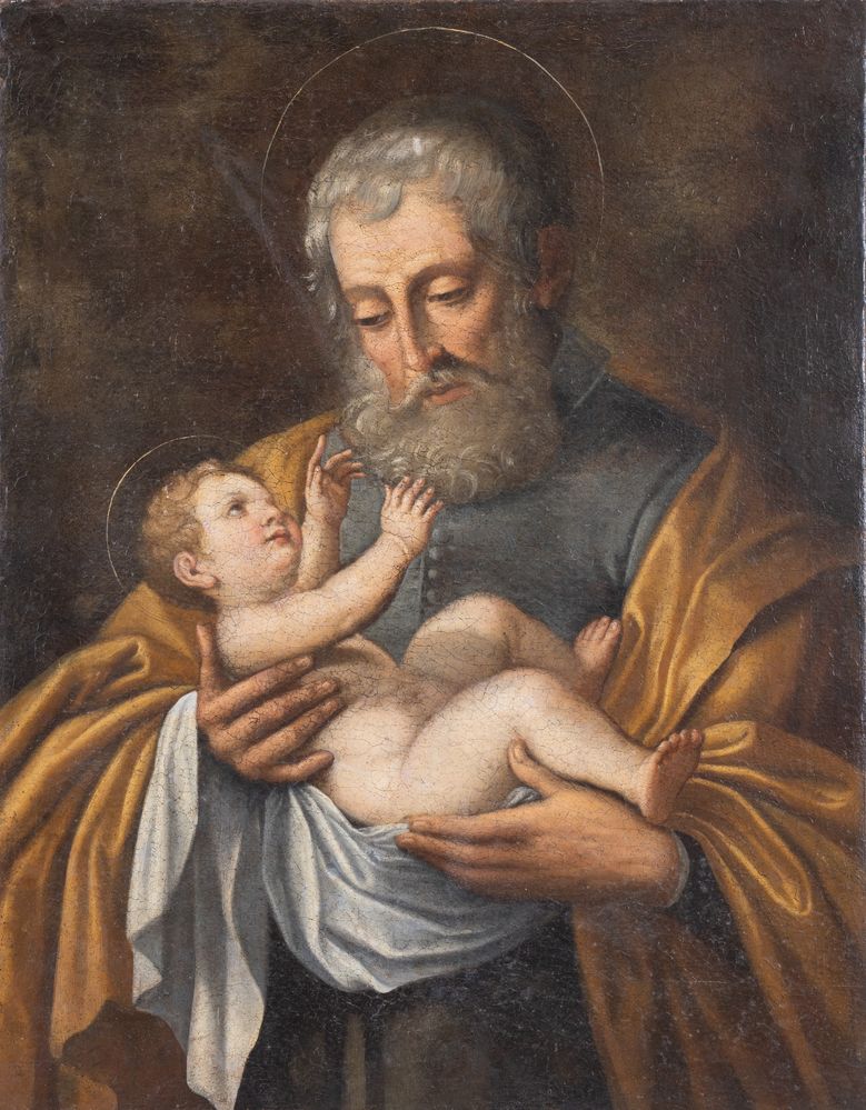 Maestro emiliano del XVII secolo. "San Giuseppe con il Bambino". Olio su tela. Cm 78,5x68.