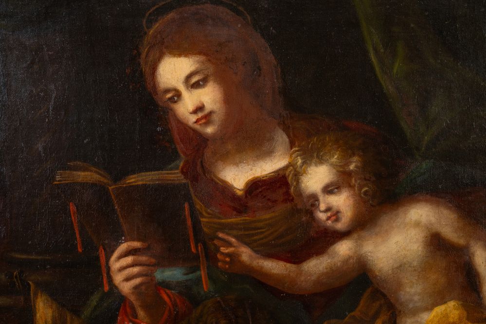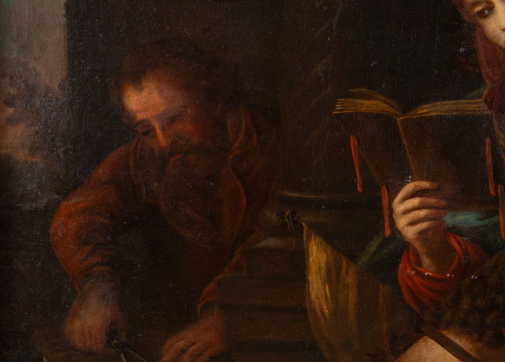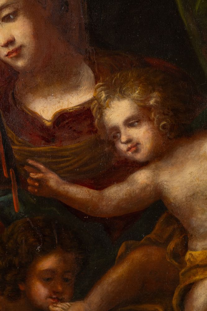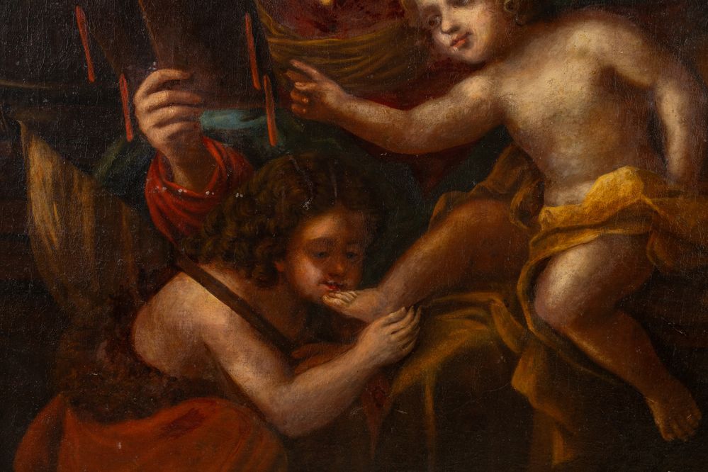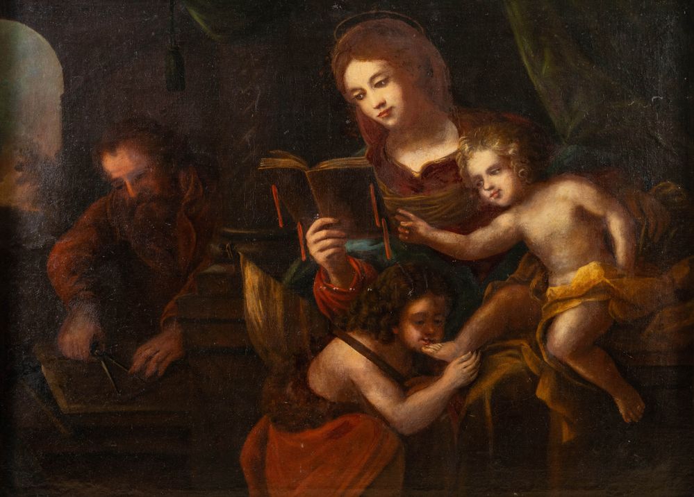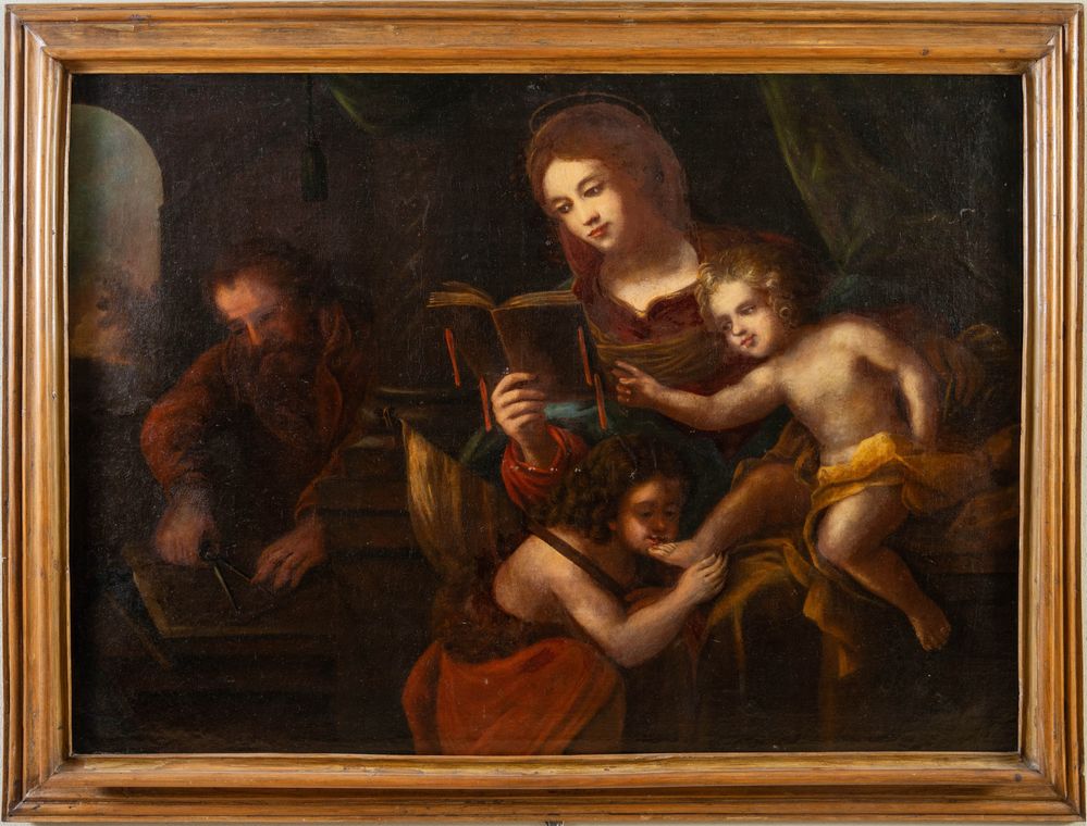 Maestro del XVII secolo. "Sacra Famiglia con San Giovannino". Olio su tela. Cm 95,5x134. (restauri)