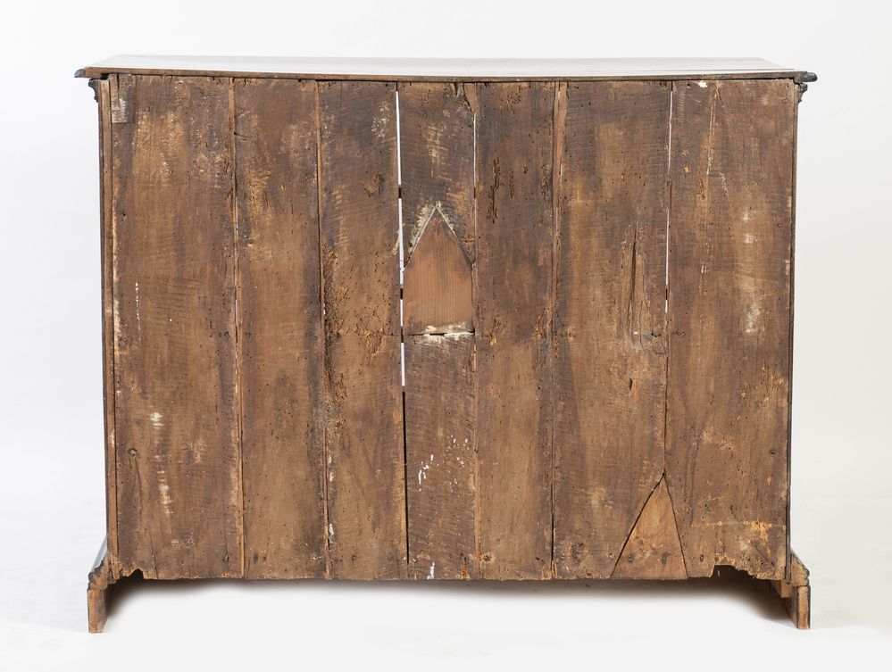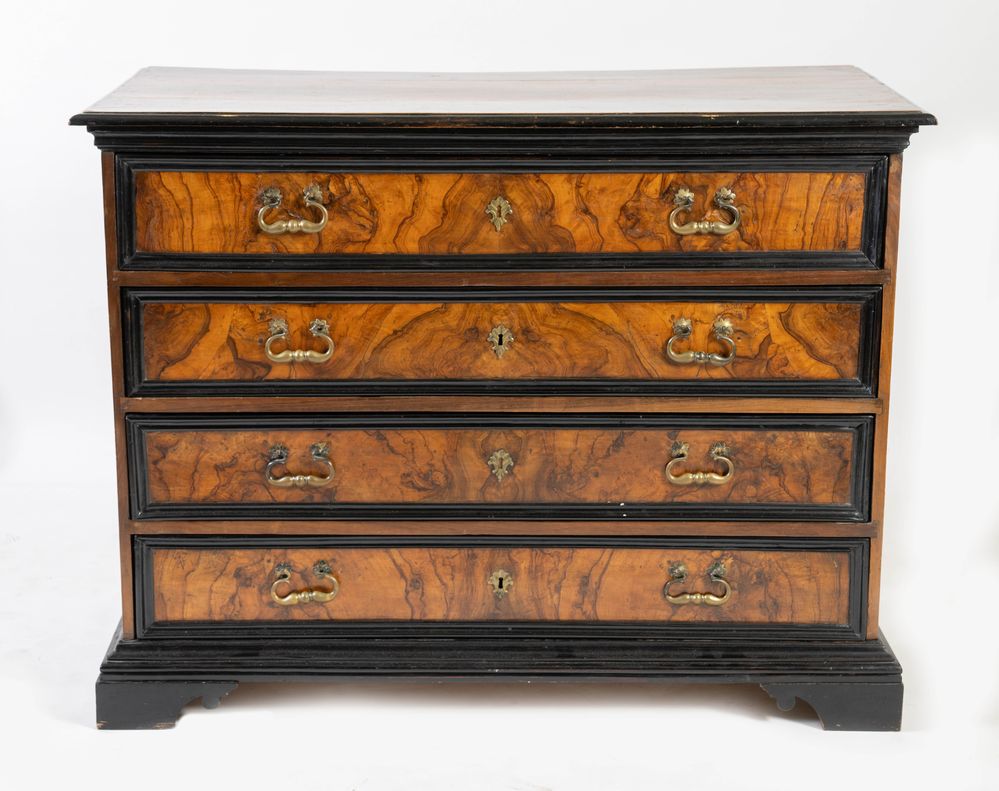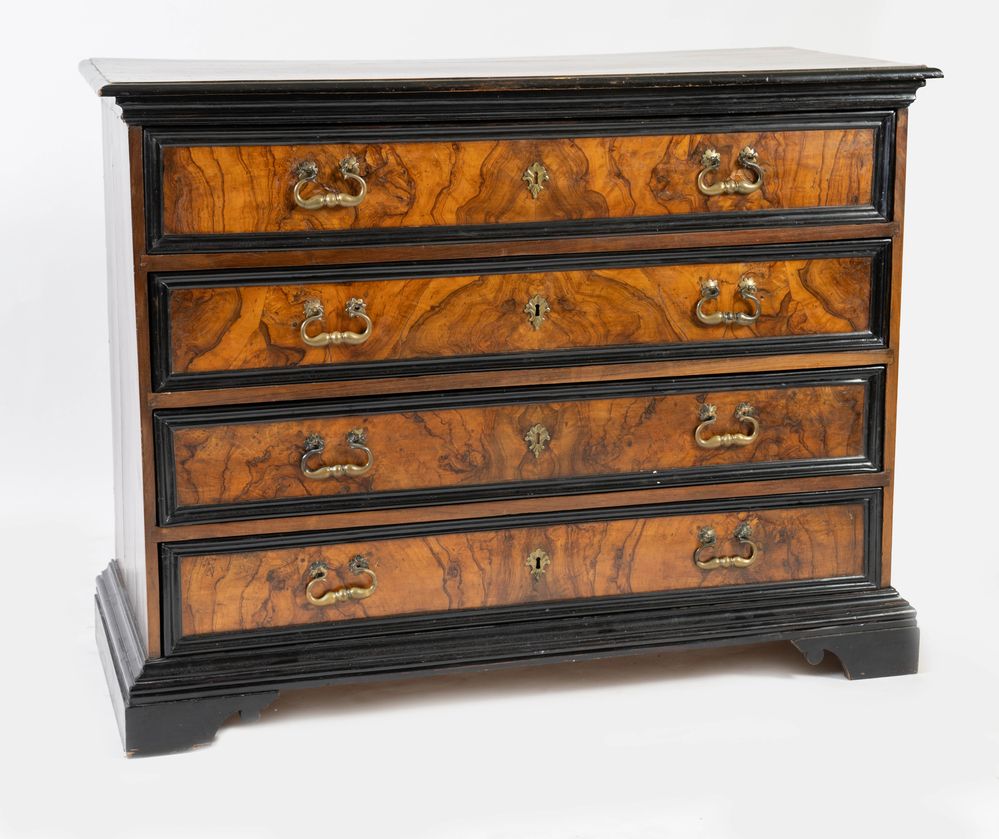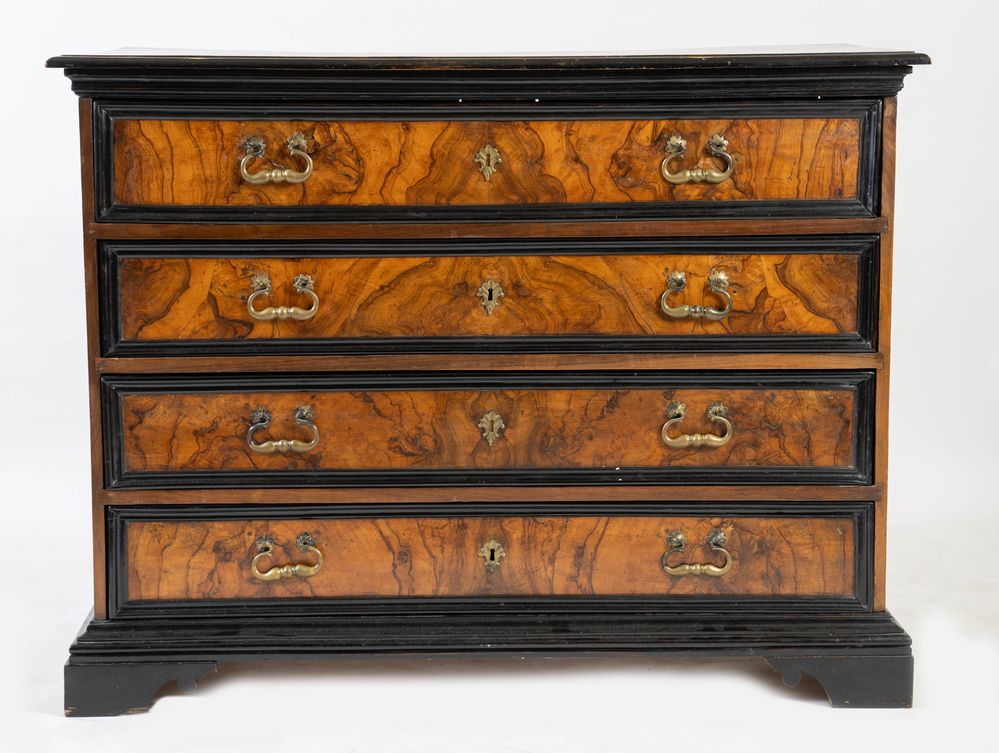 Canterano in massello di noce con cornici ebanizzate e fronte dei cassetti lastronato in radica di noce. Piano a becco di civetta, cornicione modanato, sorretto da piedi a mensola. Emilia, ultimo quarto del XVII secolo. Cm 109x140x61.