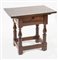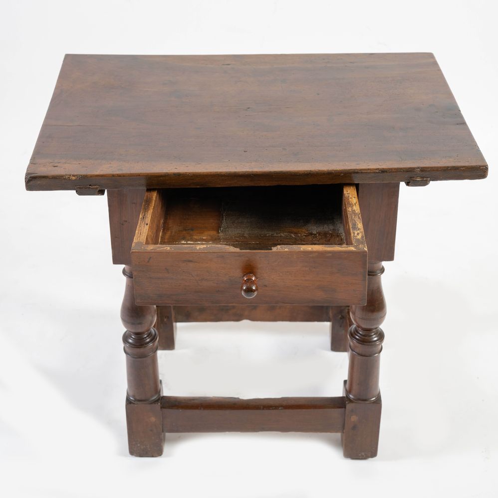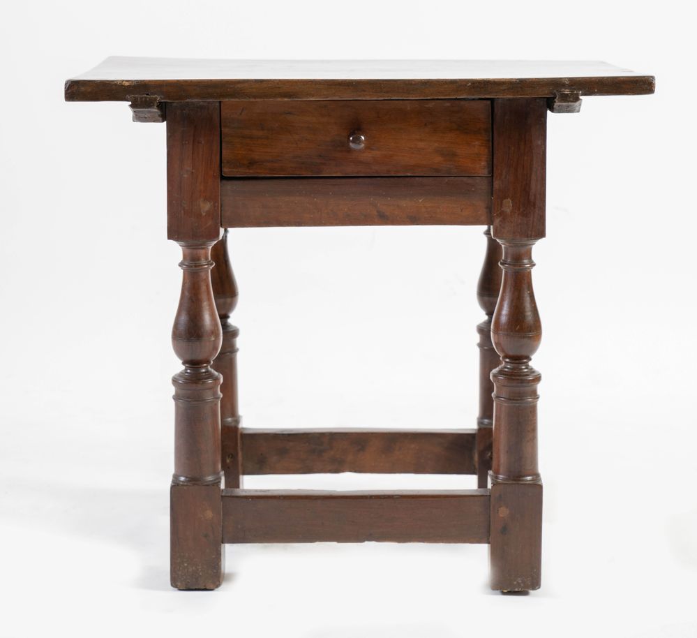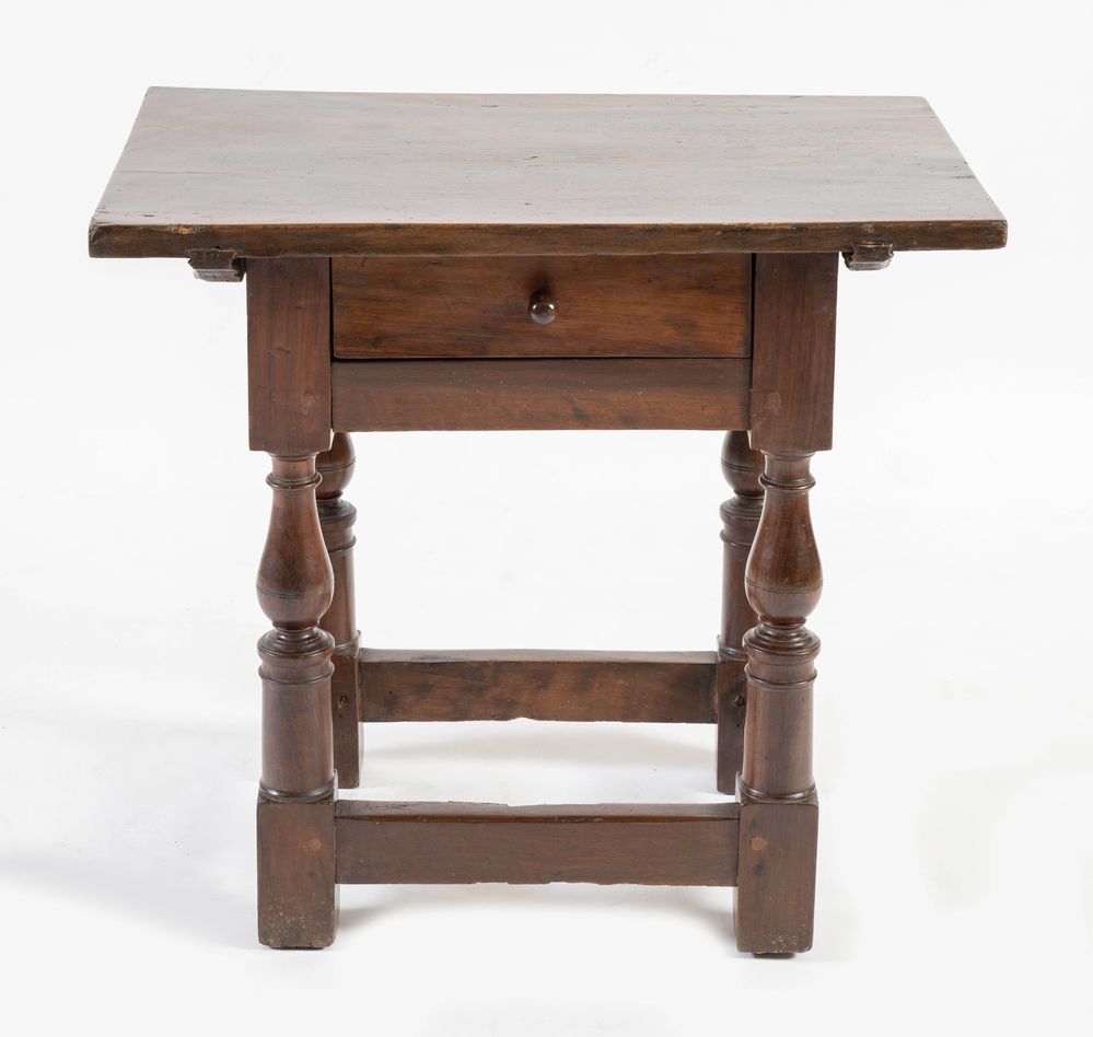 Tavolino a rocchetto in massello di noce. Sostegni a balaustra torniti, raccordati da traverse. Piano fortemente aggettante e con cassetto in fascia. Bologna, verso la metà del XVII secolo. Cm 66x72x48. (restauri)