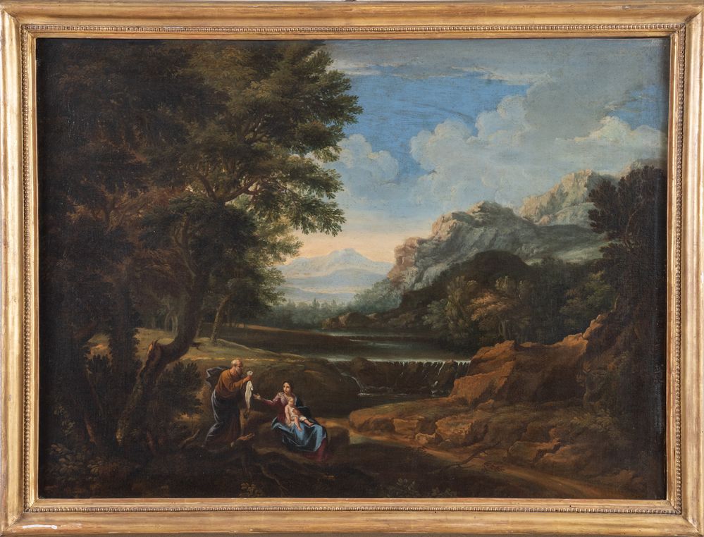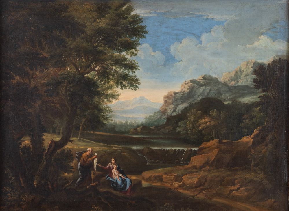 Maestro romano della fine del XVII secolo. "Riposo durante la fuga in...