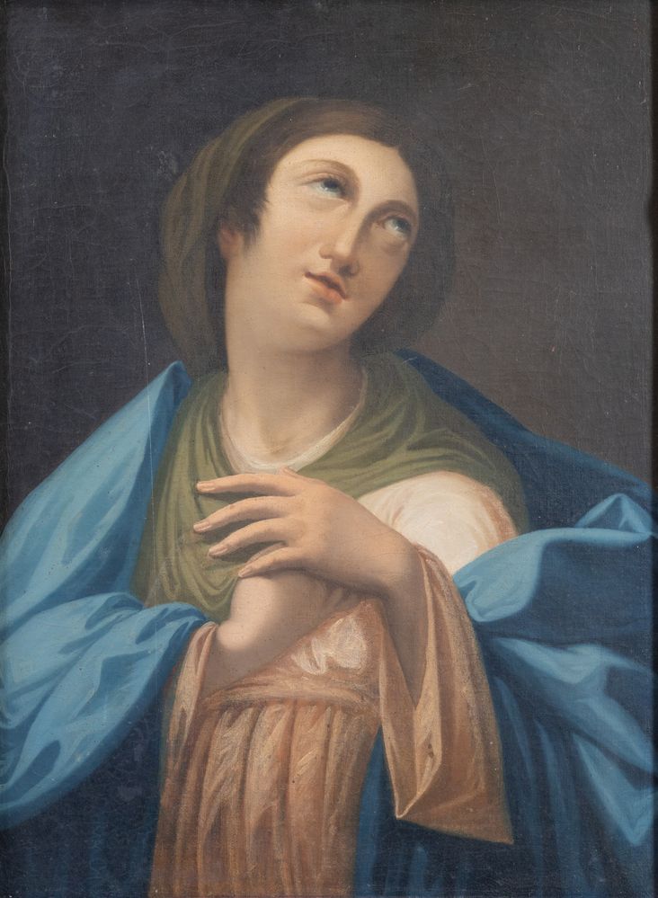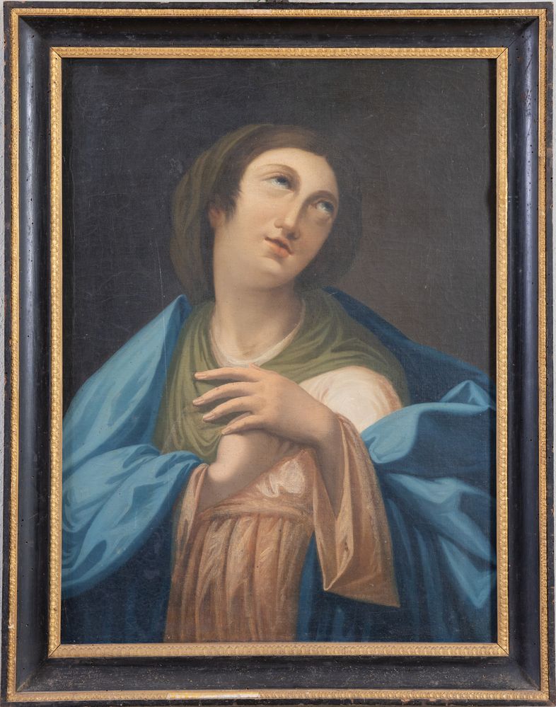 Maestro della fine del XVIII secolo. "Madonna in adorazione". Olio su tela. Cm 73x55,5.