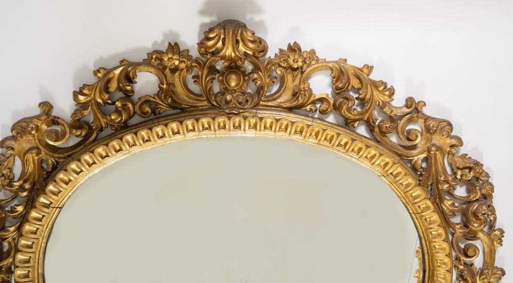 Specchiera a cartoccio ovale in legno intagliato e dorato. Toscana, XIX...