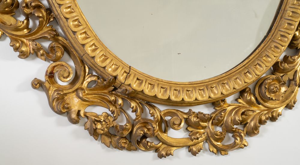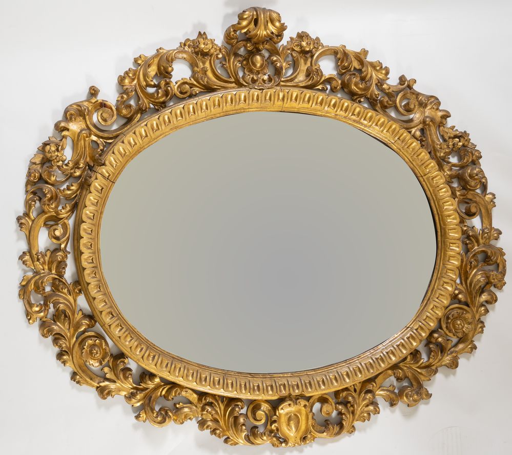 Lot 323 | Specchiera a cartoccio ovale in legno intagliato e dorato. Toscana, XIX...