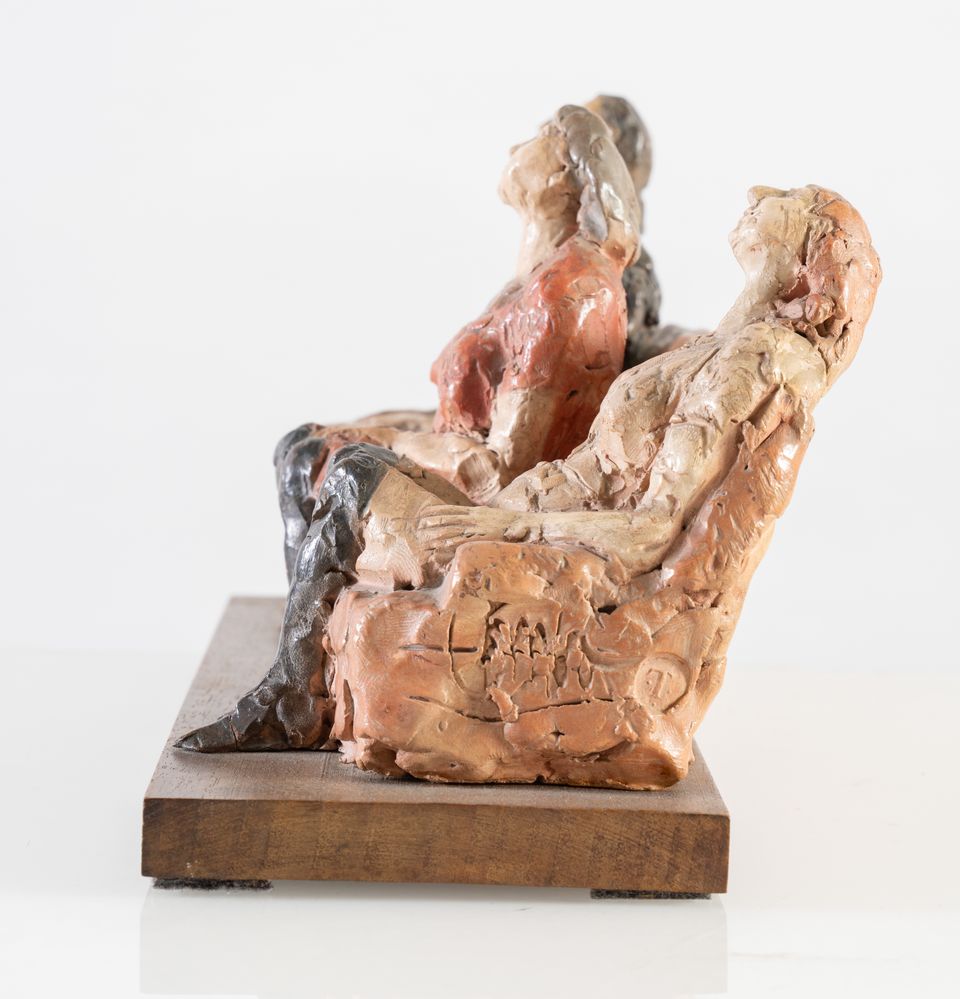 CLETO TOMBA (Castel San Pietro Terme 1898 - Bologna 1987) "Tre figure in poltrona". Scultura in terracotta policroma. Cm 15x27x13. A lato opera firmata Tomba. A lato reca timbro.