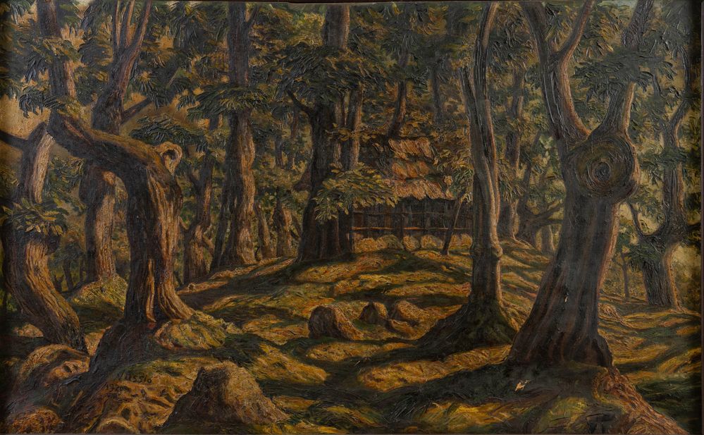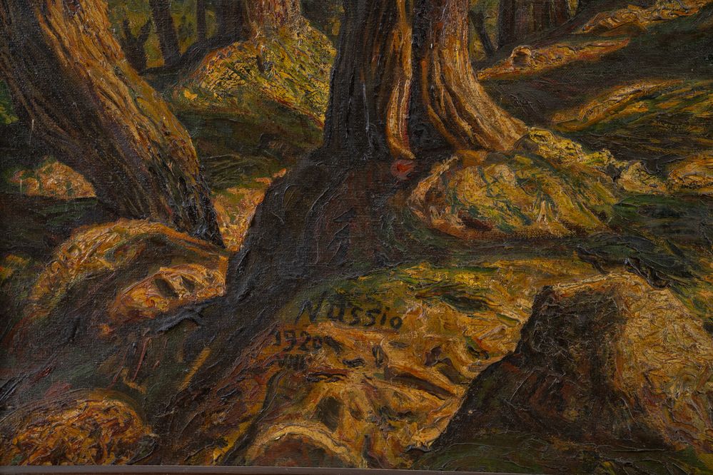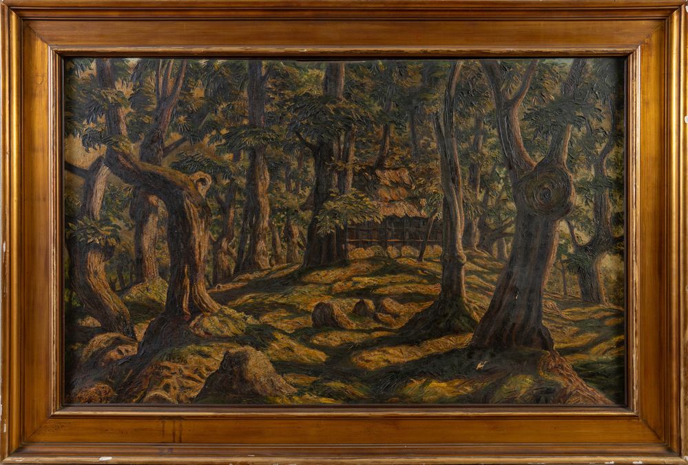 OSCAR NUSSIO (Ardez 1899 – Greifensee 1976) "Bosco", 1920. Olio su tela. Cm 92x150. Opera firmata e datata in basso a sinistra Nussio 1920, VIII. (lievi difetti)