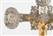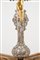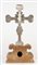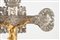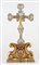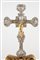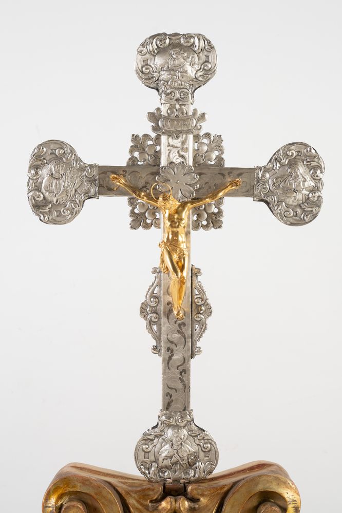 Argentiere bolognese dell'inizio del XVIII secolo. Croce in argento bulinata con Cristo in vermeille, Sant'Antonio abate, San Giovanni, San Giuseppe e San Rocco. Poggiante su base lignea con stemma nobiliare, dorato a mecca. Croce: cm 54,5x36x5,5. Con basamento: 75,5x36x13.