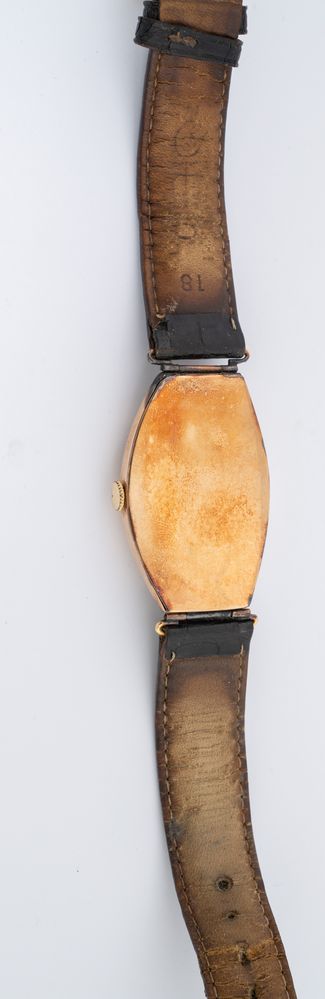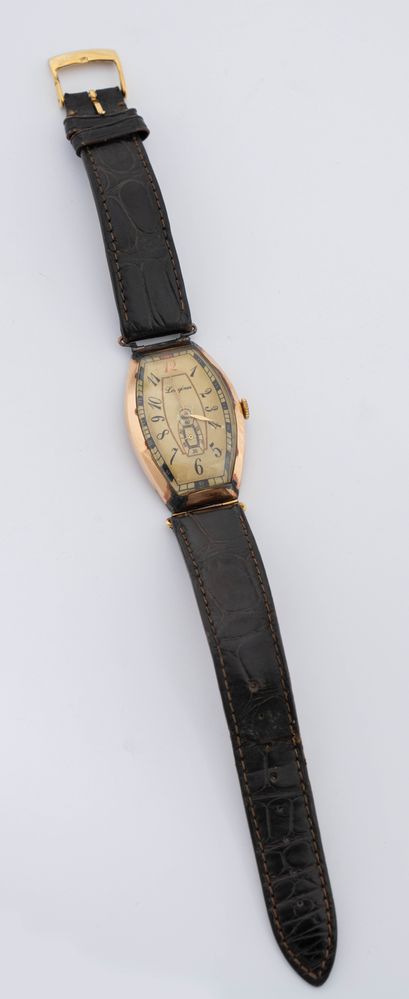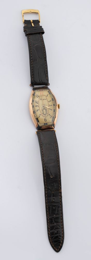 LONGINES Orologio da polso Anni Venti, destinato al mercato Russo, cassa tonneau in oro 14K (difetti), quadrante con numeri arabi (segni di restauro), piccoli secondi al centro, vetro plastica, movimento a carica manuale. Cinturino in pelle con fibbia non pertinente. Dimensioni 45 x 29 mm. Necessita di revisione.